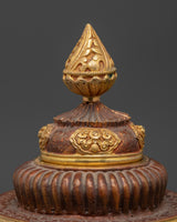 This Buddhist Offering Tibetan rice pot measures 20.5 cm in height, 11.5 cm in breadth, and weighs 0.638 kg. It is expertly made from copper and plated in mercury gold, with delicate detailing, a domed top, and a finely tiered base. Its elegant style and shining gold embellishments make it an eye-catching centerpiece for your altar, puja table, or spiritual decor. The pot's sturdy design maintains its beauty and longevity for many years to come.