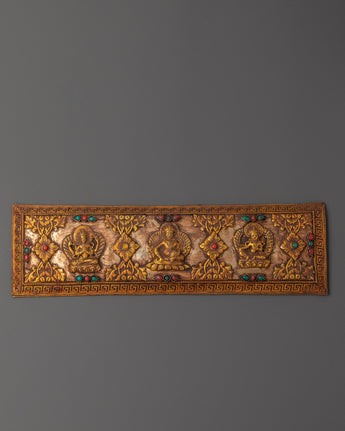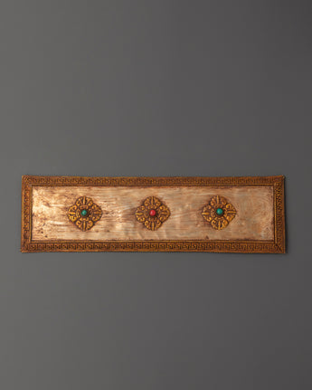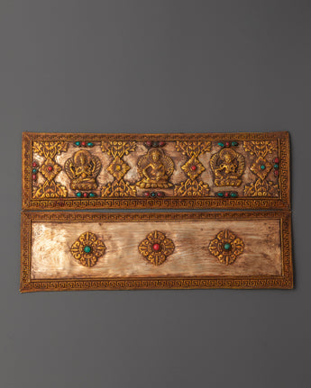 This Handcrafted Buddhist Prayer Book immerses you in Tibetan Buddhism's rich spiritual legacy. This prayer book, which measures 11cm in height and 36cm in breadth and weighs 0.87kg, is intended for both spiritual and ornamental use. The book is made of copper with gold and silver polish and has detailed turquoise and coral inlay, which adds color and spiritual symbolism to the design. It's an essential item for anybody seeking spiritual connection and enlightenment, making it ideal for prayers, rituals, and meditation.