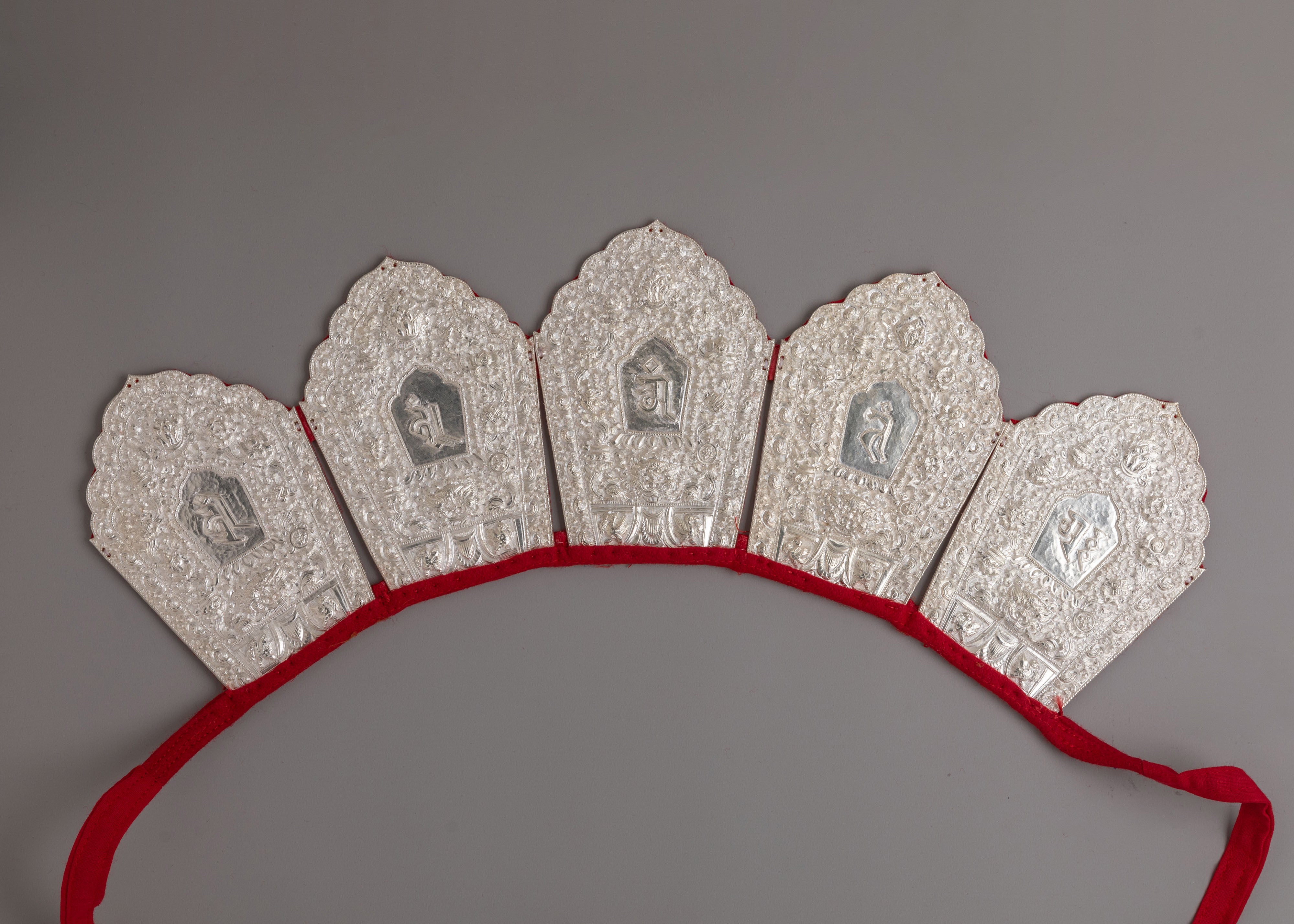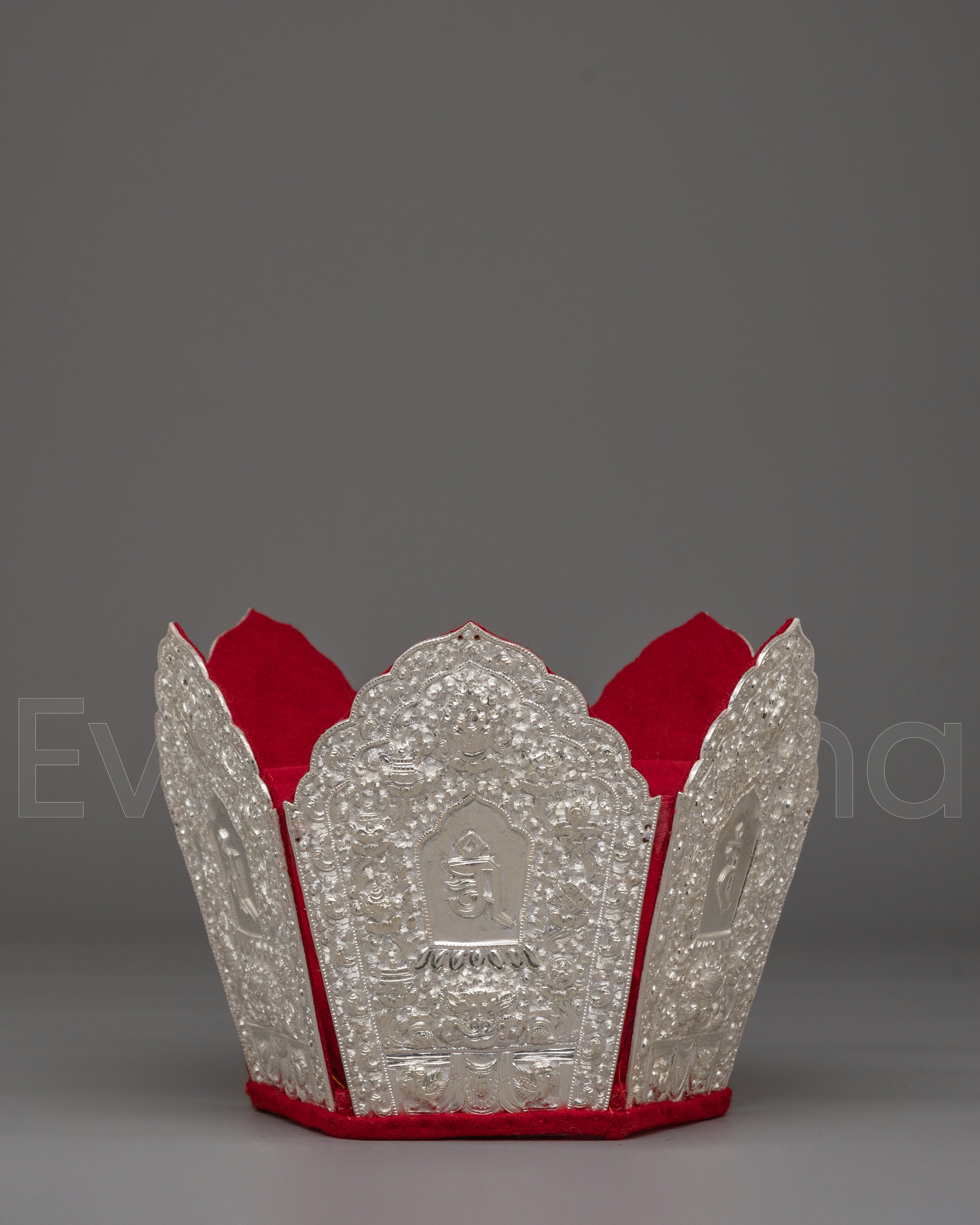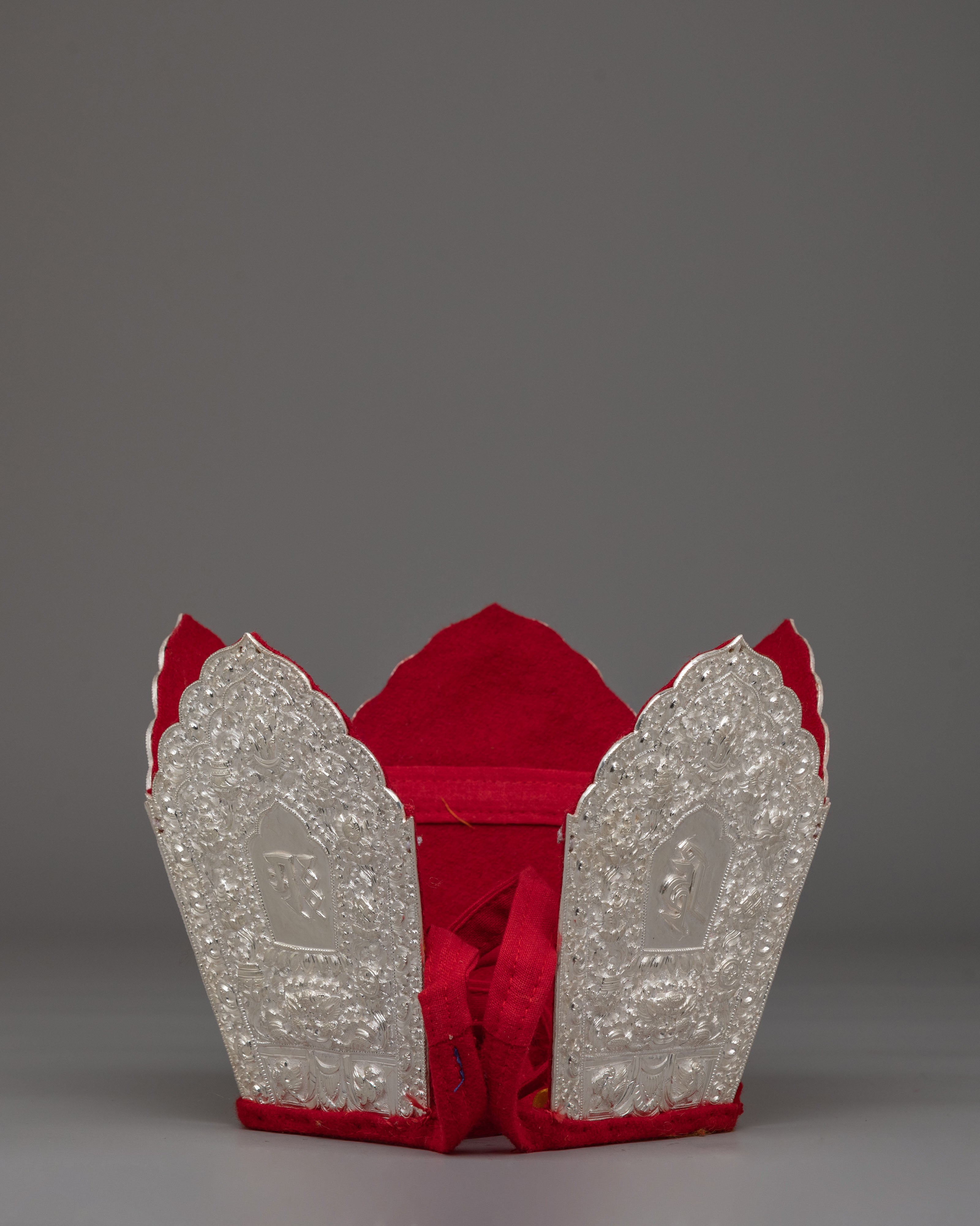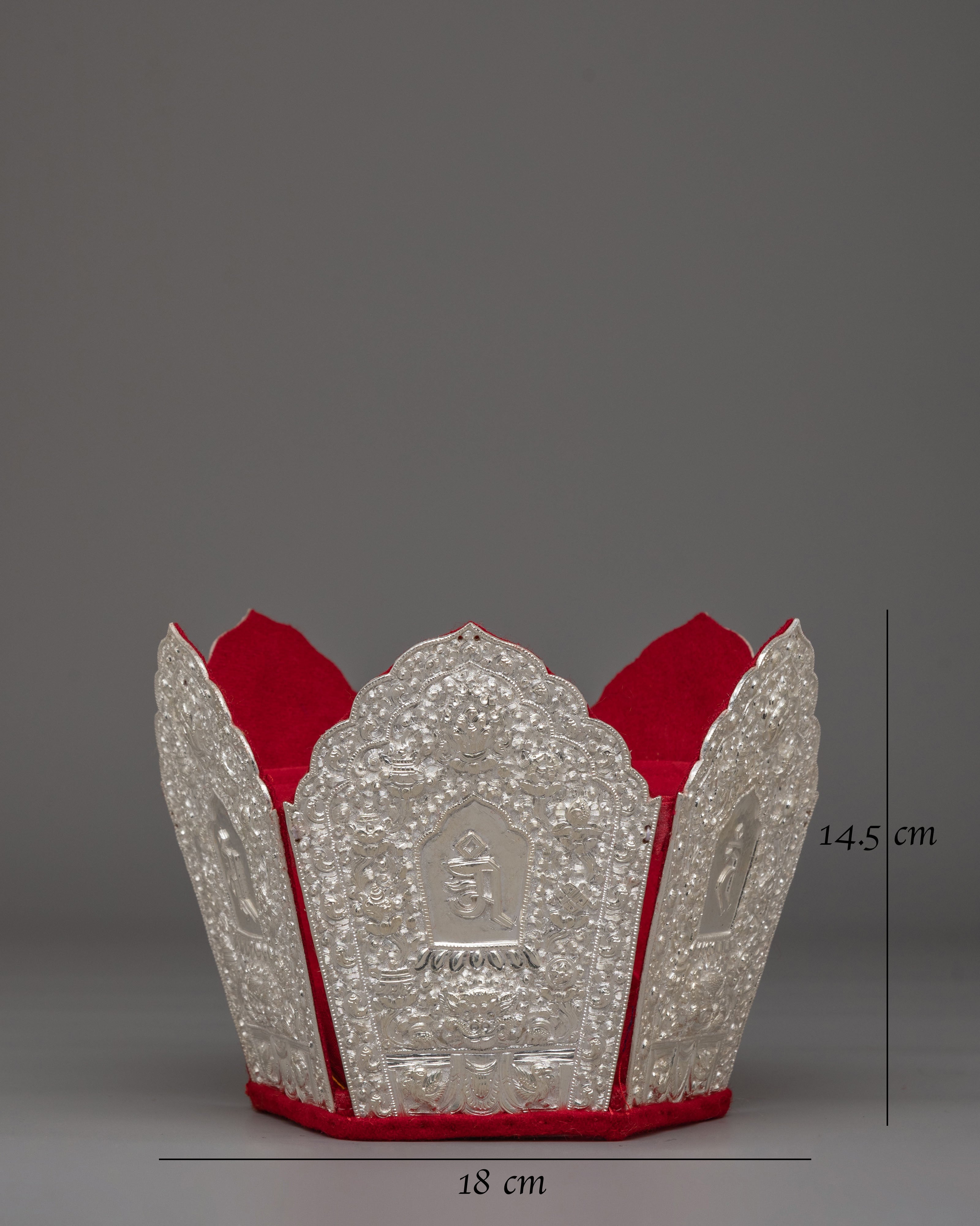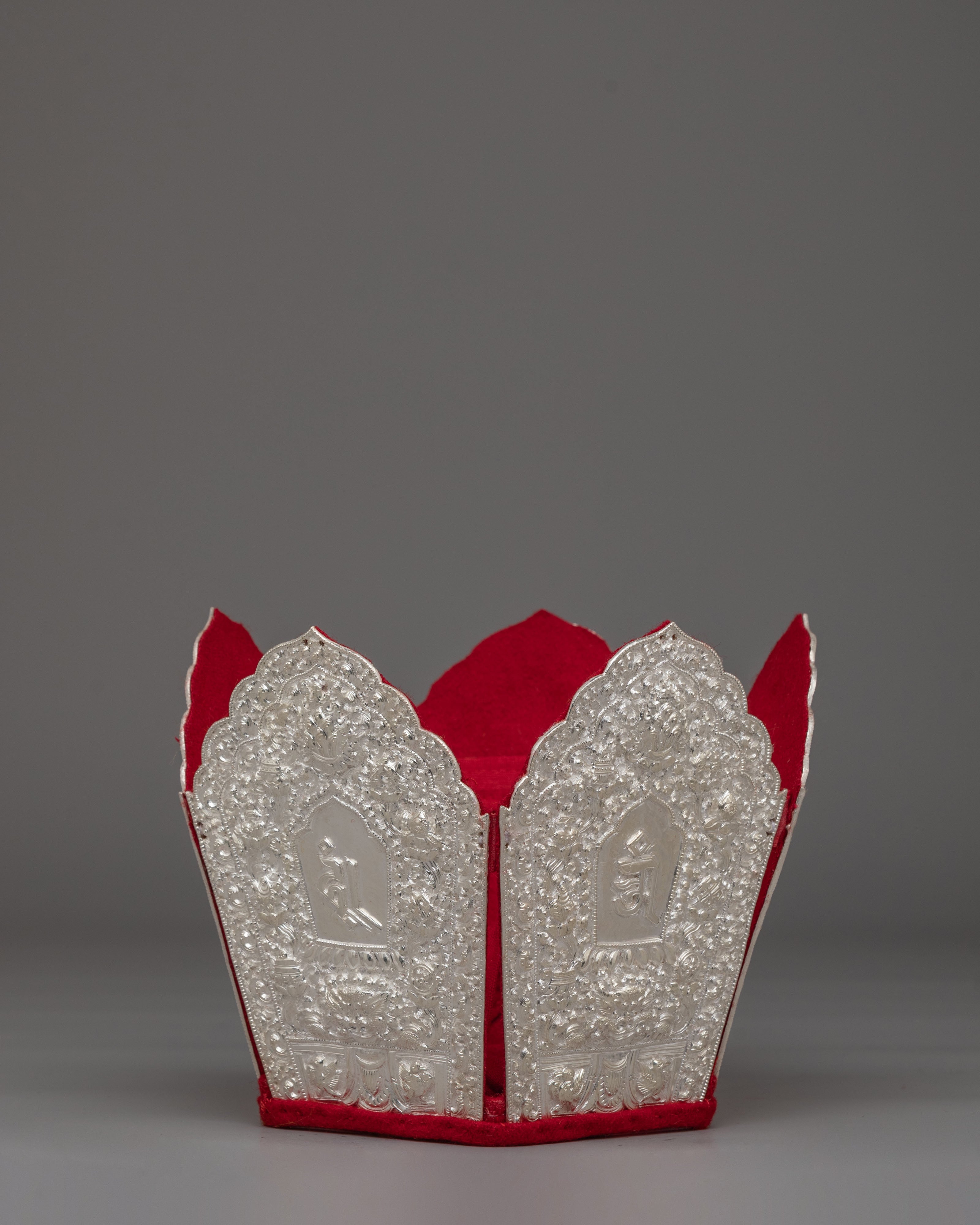 The crown features detailed embossed panels engraved with sacred mantra inscriptions and traditional Tibetan motifs. Each panel is framed with intricate floral carvings and ornamental patterns that enhance its ritual presence. The mantra symbols are carefully engraved to represent sacred sound and spiritual vibration in Vajrayana practice. The red inner lining provides a striking contrast to the silver exterior, highlighting the refined detailing of this Buddhist ritual crown.