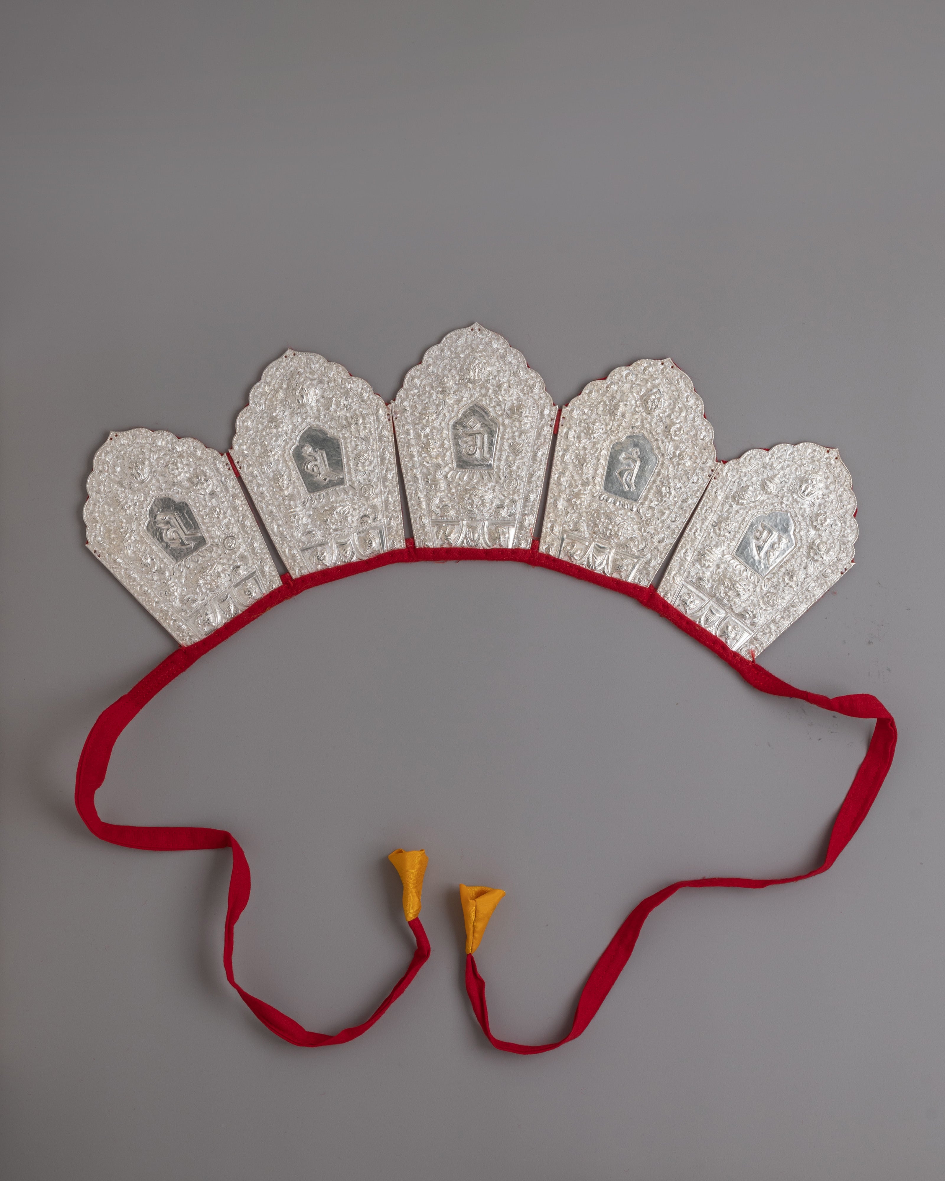 In Tibetan Buddhism, mantra inscriptions represent protection, blessings, and spiritual transformation through sacred sound. This silver ritual crown symbolizes devotion, awareness, and commitment to meditation practice. Ideal for Buddhist practitioners, Himalayan art collectors, and altar decor setups, this handcrafted Tibetan mantra crown serves as a meditation headpiece, prayer ceremony crown, and sacred Buddhist ritual accessory designed for authentic spiritual practice and shrine display.