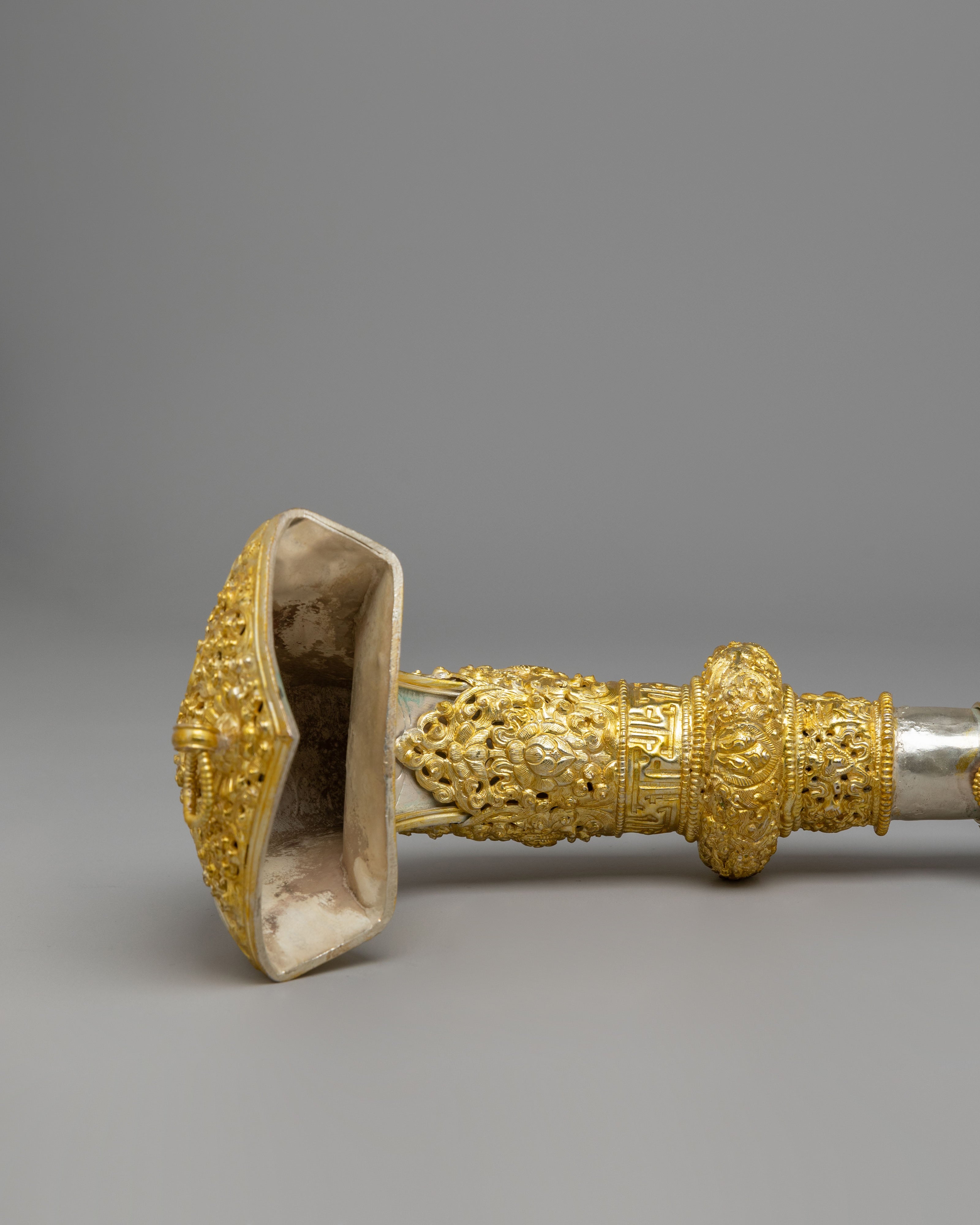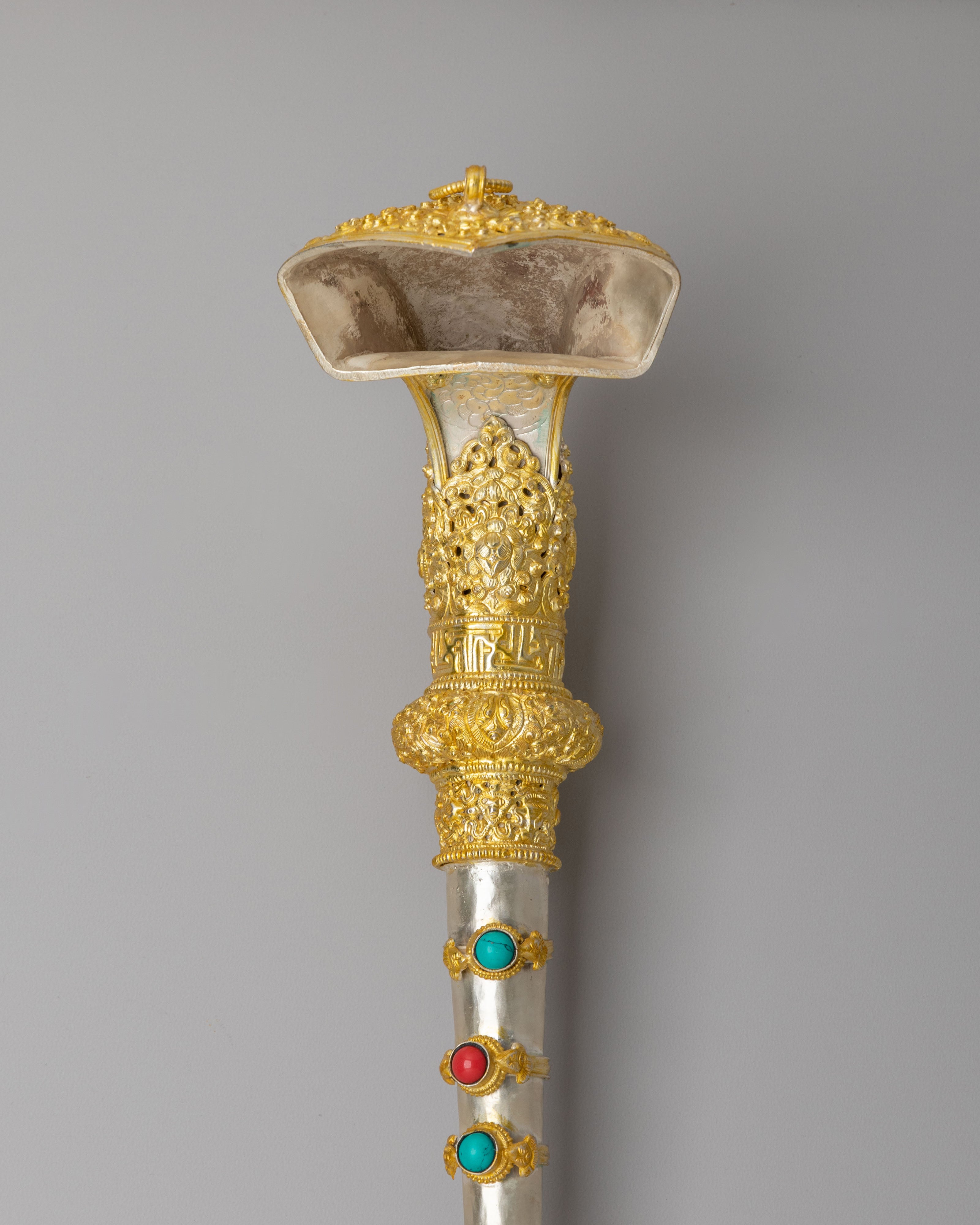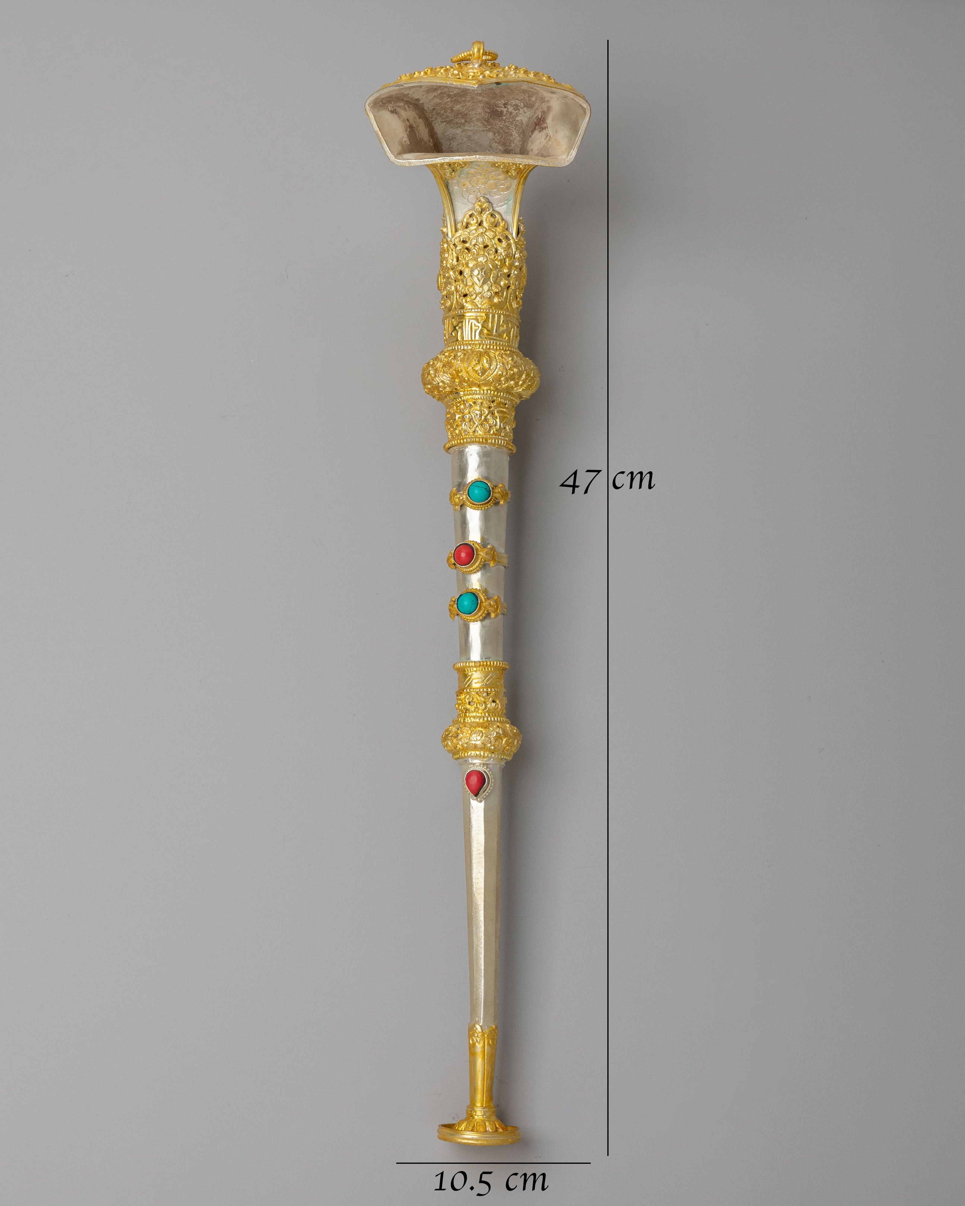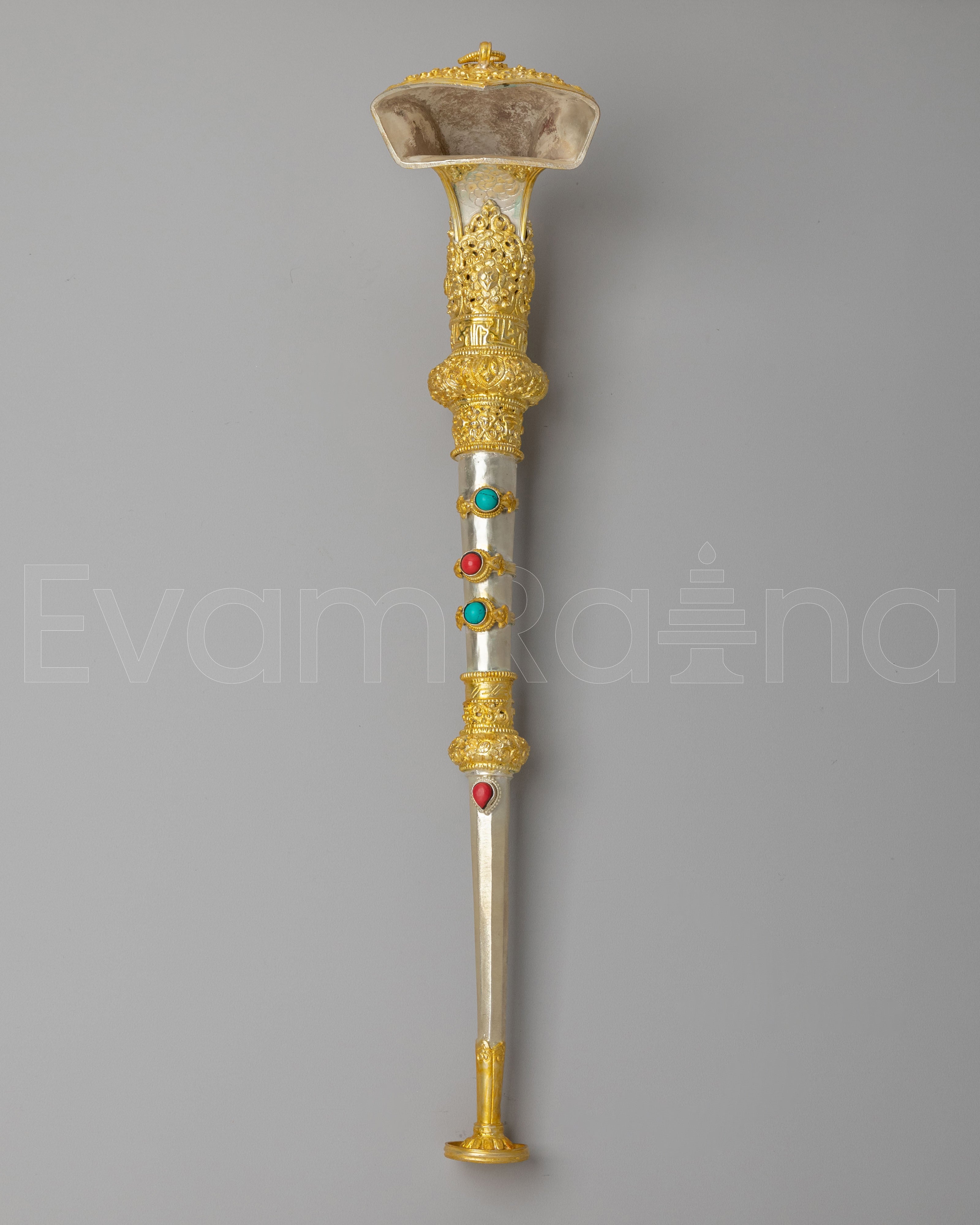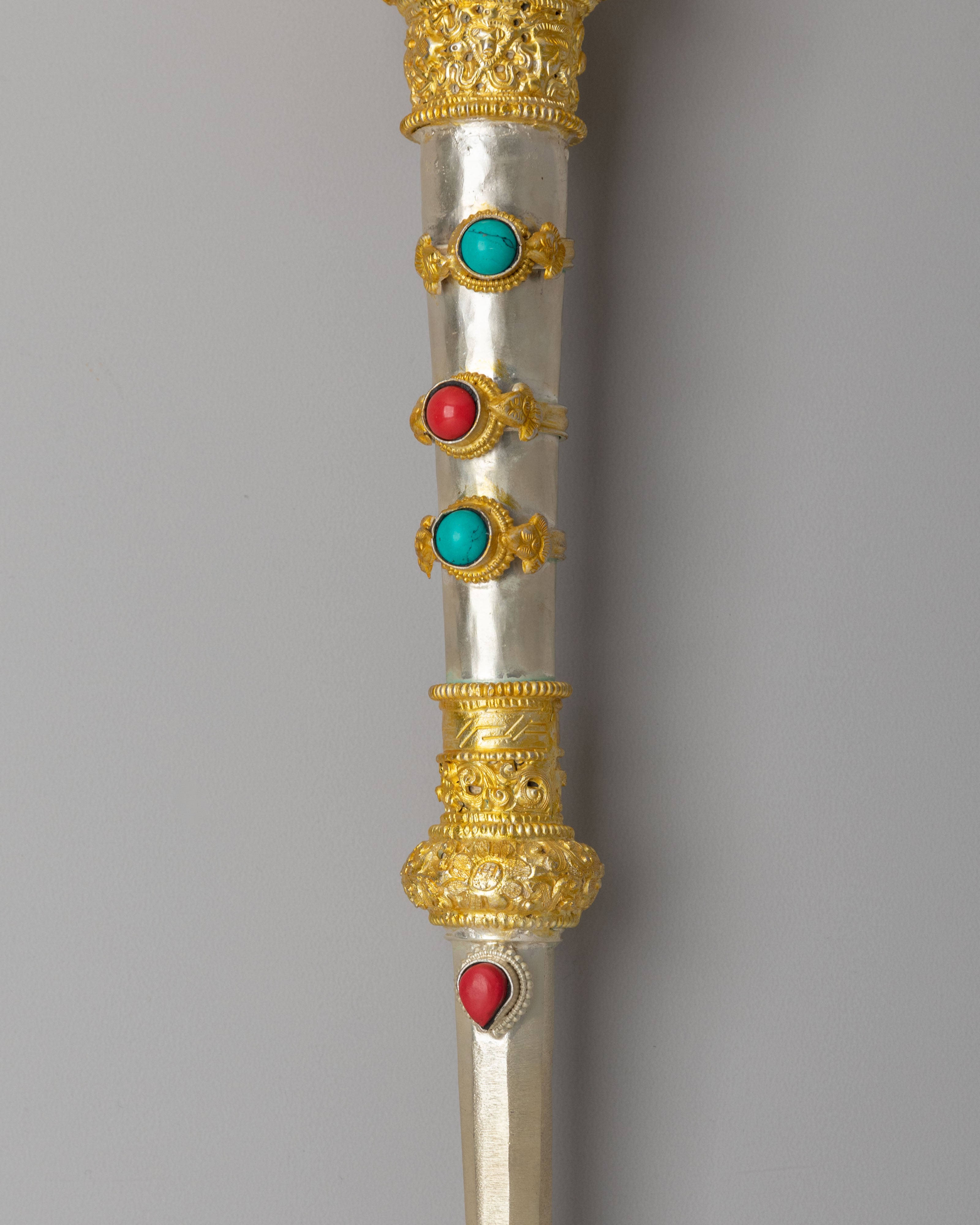 The Buddhist Ritual Kangling features intricate electro gold and silver plating, with beautiful turquoise and coral gemstones embedded into the vessel. The turquoise represents healing and spiritual clarity, while the coral is known to provide protection and vitality. The gold plating accentuates the sacredness of the ritual tool, symbolizing wisdom and divine blessings, while the silver plating enhances its reflective properties, aligning with the Tibetan tradition of invoking light and energy. The detailed engravings on the handle further enhance the sacred symbolism, incorporating motifs of wisdom, purity, and protection.