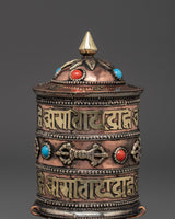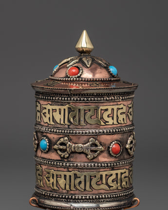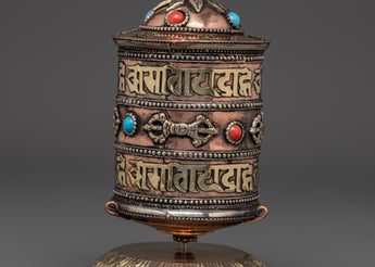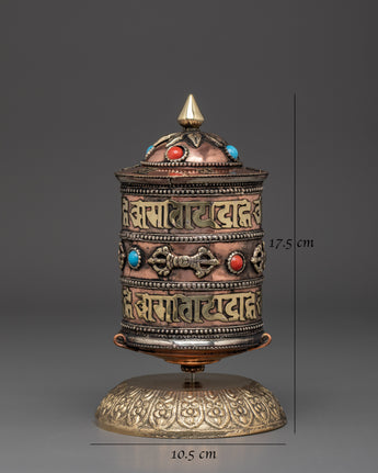 This Buddhist Ritual Wheel is a beautifully crafted spiritual tool designed to deepen your meditation and ritual practices. Standing 17.5 cm tall and weighing 0.35 kg, it is made from brass and adorned with vibrant coral and turquoise stones, adding both visual beauty and symbolic significance. Rooted in Tibetan Buddhist traditions, this wheel is believed to amplify prayers and mantras, channeling positive energy and blessings into your life. Its presence enhances any altar or sacred space, fostering a stronger spiritual connection and inviting peace, healing, and mindfulness during your meditation sessions. It is an essential piece for those seeking to enrich their spiritual journey.