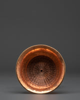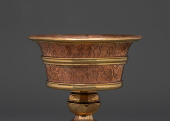 This butter lamp is a remarkable example of traditional Tibetan craftsmanship, featuring brass highlights and intricate engravings on its copper body. It is both a useful tool and a beautiful piece of decor due to the intricate patterns that enhance its aesthetic and spiritual appeal. It provides a gentle, welcoming light that creates a spiritual atmosphere, ideal for meditation, prayer, and ceremonial events, whether it is filled with tea light candles, traditional ghee butter, or oils.