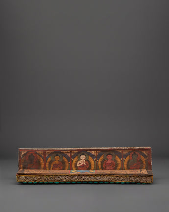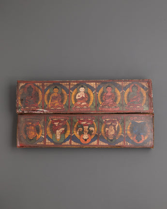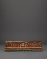 This Buddhist Sacred Text Protector, a stunning fusion of spiritual symbolism and traditional craftsmanship, will help you honor and protect your sacred scriptures. This sacred book cover, measuring 34.5 cm in width and 8.5 cm in height, is designed to preserve Buddhist teachings with care and respect. Its surface is adorned with three intricate Buddha figures that represent wisdom, protection, and spiritual awakening. This precious artifact is more than just a protective cover; it is a devotional piece intended to preserve the teachings of enlightenment.