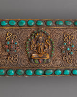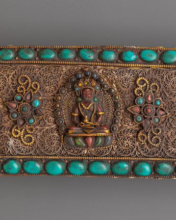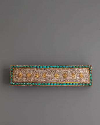 This scripture cover, crafted from solid metal and finished with silver plating, gold accents, and intricate engravings, exudes a profound sense of spiritual significance. Artificial turquoise stones line the margins and surround each god, adding to the design's visual appeal and energetic balance. The vibrant turquoise contrasts nicely with the worn silver finish, providing a sense of timeless depth. This guardian is more than simply a useful item; it is a shrine-worthy artifact that will enhance any spiritual setting or altar.