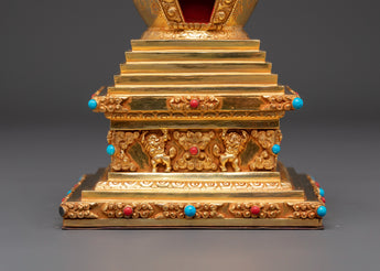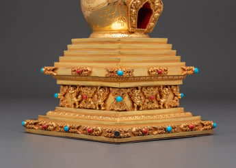 This gold-plated Buddhist stupa is more than a beautiful piece of art; it embodies the sacred teachings of the Buddha. Representing the body, speech, and mind of the Buddha, the stupa holds profound spiritual significance and is traditionally used to enshrine relics or sacred offerings. The turquoise stones enhance their symbolic value, signifying wisdom and protection in Tibetan Buddhism. Handcrafted with care, this stupa is a powerful symbol of peace, enlightenment, and mindfulness, making it an ideal complement to your meditation and prayer rituals.