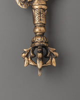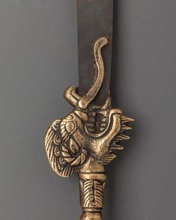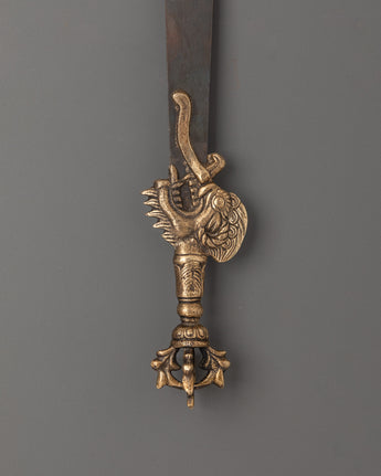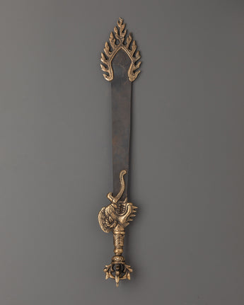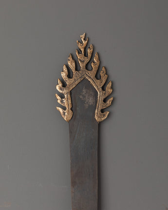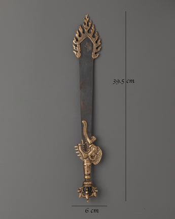 Handcrafted with a blend of brass and iron, this ritual sword highlights skilled craftsmanship and symbolic design. Its elegant form makes it suitable not only as a ceremonial instrument but also as a striking piece of sacred décor. Lightweight at 0.33kg, it is easy to place on a shrine or carry during rituals. Revered as a spiritual artifact, this Buddhist sword embodies strength, wisdom, and the ability to dispel negative forces, making it an essential element for practitioners and collectors alike.