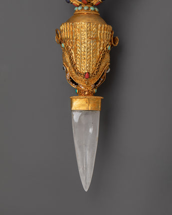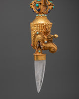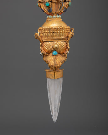 The Buddhist Three-Sided Phurba is an elegant ceremonial dagger crafted from gold-plated copper, featuring a transparent crystal blade and a turquoise stone. It measures 57 cm in height and 10 cm in breadth, making it an excellent tool for energy work, tantric ceremonies, or as a powerful spiritual centerpiece. The powerful deity, engraved into the handle, represents protection and transformation during holy rituals.