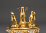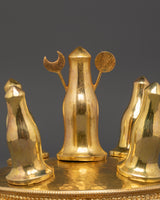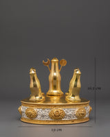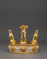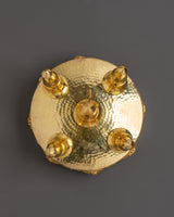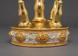 Crafted from copper and beautifully finished with gold and silver plating, this torma is a striking and meaningful centerpiece. It stands 16.5 cm tall, 19 cm wide, and weighs 1.01 kg, making it practical and elegant for shrine display. The intricate detailing and balanced form reflect the refined artistry of Tibetan ritual objects.