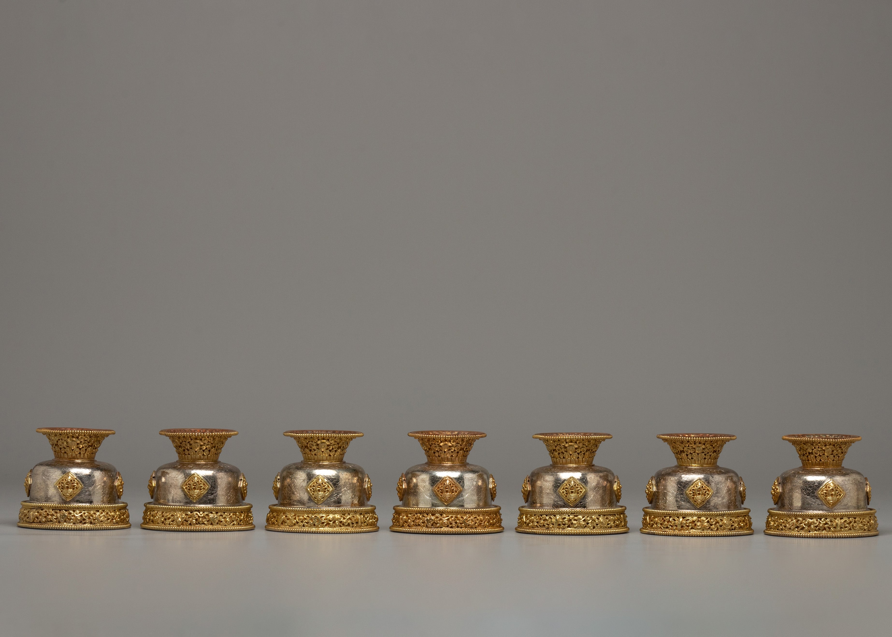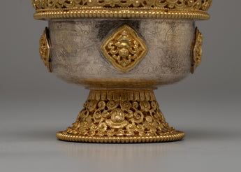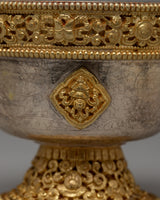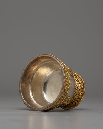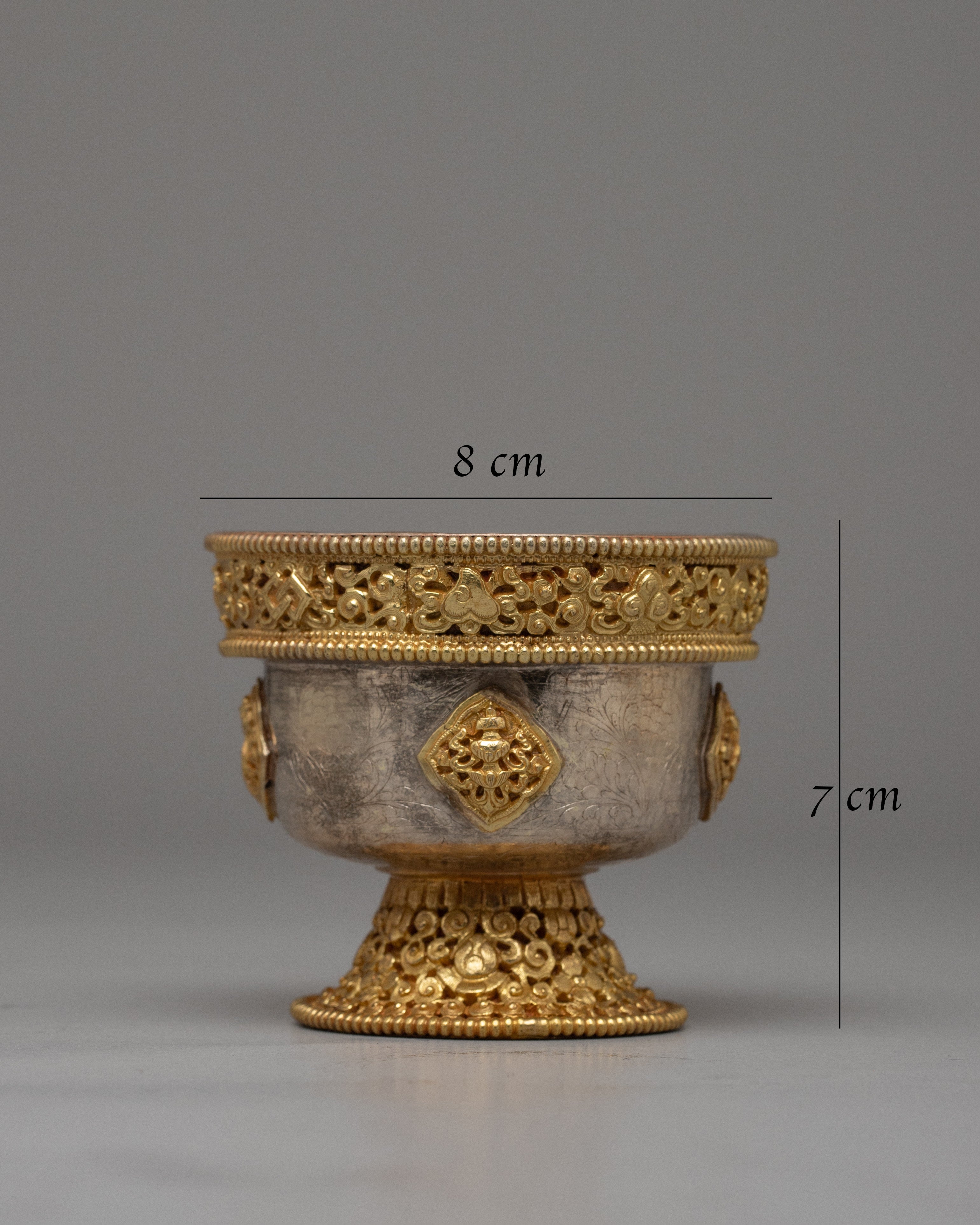 The Buddhist Water Bowls Set is an example of both spiritual significance and expert craftsmanship. The careful craftsmanship on a copper body of each bowl demonstrates the devotion to custom and respect for Buddhist ceremonies. These bowls, adorned with gold and pure silver plating, exude a sense of purity and holiness that invites practitioners to participate in acts of purification and offering.