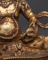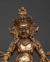 Dzambhala is a protective deity associated with wealth and prosperity. Many forms and traditions are associated with this wealthy deity, but he is usually depicted as yellow in color and holding a mongoose in his left hand. This statue has accurate traditional iconography and fine details.