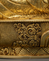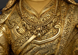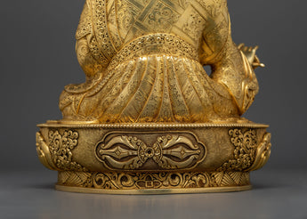 The Budh Guru Rinpoche statue is a magnificent depiction of the famous Padmasambhava, the spiritual guru who introduced Buddhism to Tibet. This statue, made of high-quality copper and gilded with 24K gold, depicts Guru Rinpoche's spiritual presence and profound wisdom. It is also embellished with gold and acrylic paints. Guru Rinpoche, often known as the "Precious Master," is respected for his teachings that contributed to the development of Tantric Buddhism.