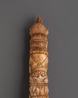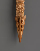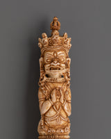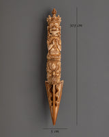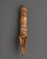 Rooted in Tantric rituals, this hand-carved buffalo bone phurba dagger, sourced from ethical origins, showcases intricate details that reflect spiritual symbolism and the finest Himalayan craftsmanship. Standing at 30.5 cm tall, 5 cm wide, and weighing 0.25 kg, it depicts wrathful deities and motifs that amplify its power. Every face and blade is etched to honor sacred iconography, transforming them into vessels of spiritual energy.