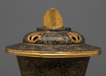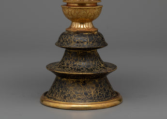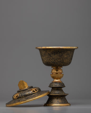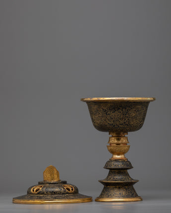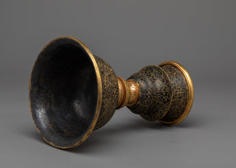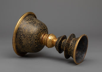 Butter Lamp Offerings, which are skillfully sculpted on oxidized copper bodies and decorated with opulent gold plating, will illuminate your sacred sanctuary with divine light. Each lamp is a profound emblem of spiritual enlightenment and dedication, acting as a beacon of light to guide the path to inner awareness. With a total weight of 3.58 kg, this collection of butter lamps is a compelling combination of aesthetic beauty and spiritual meaning, making it an essential component of Tibetan Buddhist rituals and celebrations.