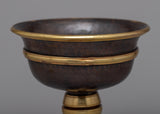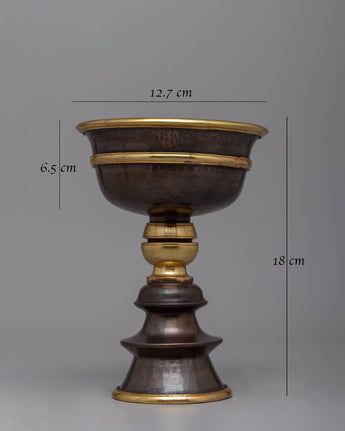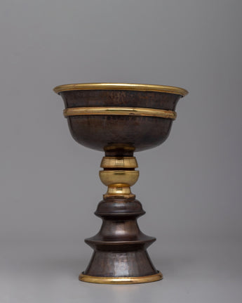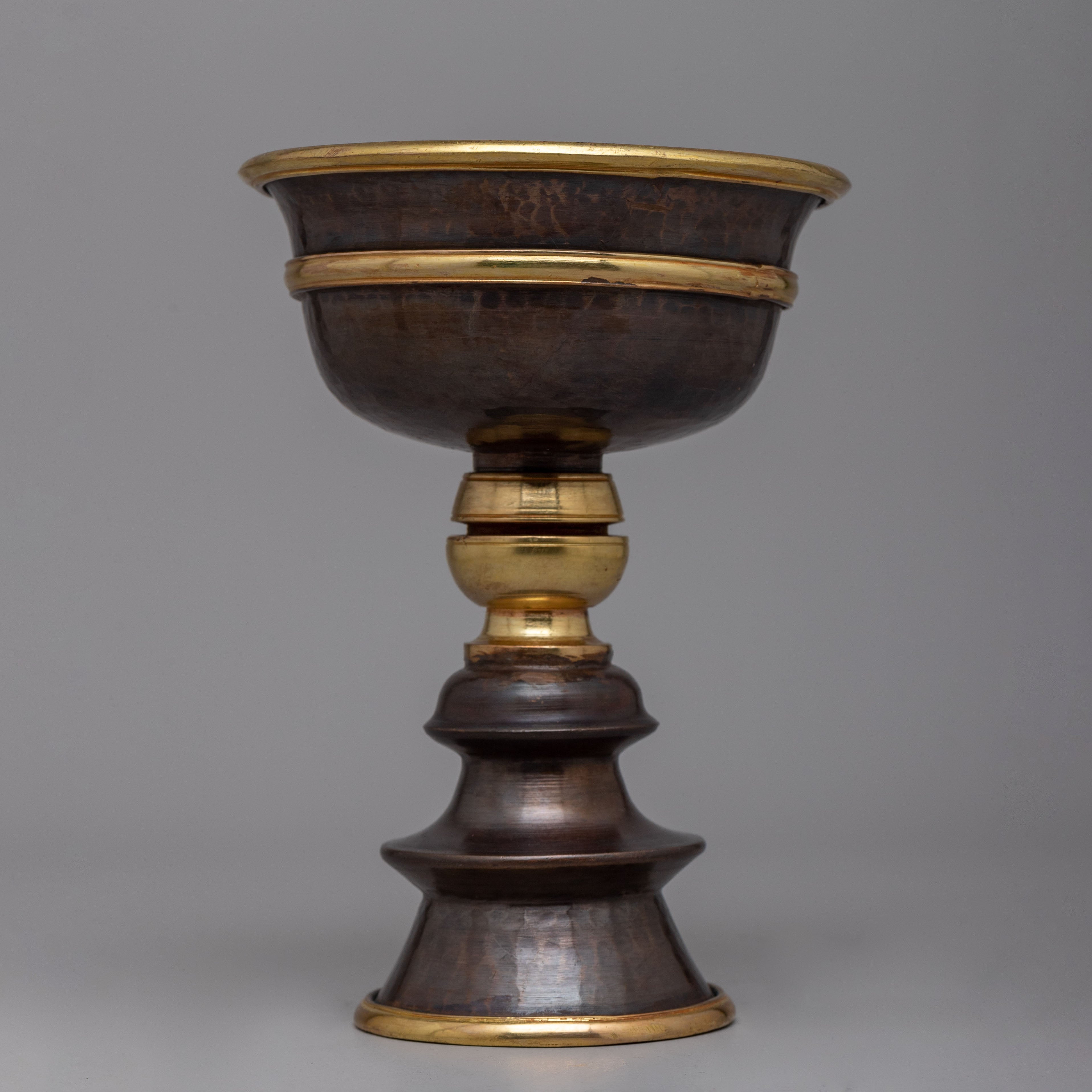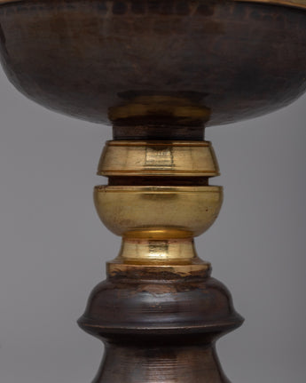The Butter Lamps Tibetan , painstakingly carved on an oxidized copper body and gold plated, will illuminate your spiritual practice. Standing at 18 cm in height, 13 cm in diameter, and 6.5 cm in inner depth, this exquisitely designed set offers enough of room for the arrangement of butter or oil. There are 1.66 kilograms in the full set.