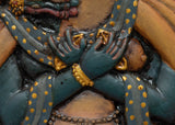 This Chakrasamvara relief art is a stunning work of art that has been meticulously handcrafted. The deity is sculpted in clay and set on a wooden ply background. The fiber border serves as a protective frame for the artwork, and the intricate design enhances its beauty. The Chakrasamvara deity is a symbol of compassion and wisdom, and this artwork would look great in any meditation room or home altar. This relief art is an excellent way to connect with Chakrasamvara's divine energy and to deepen your spiritual practice.