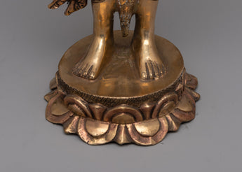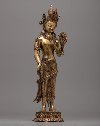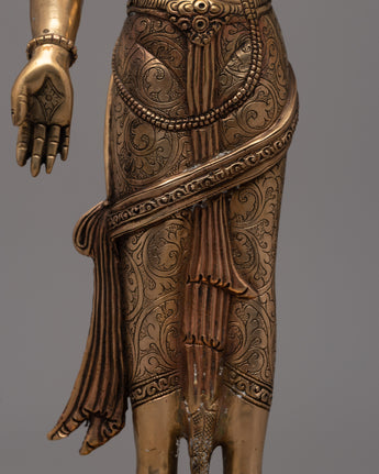 With our Standing Chenrezig Avatar Statue, you can embody the heavenly presence of the kind Bodhisattva Chenrezig. Standing at 42 cm tall and exuding compassion and serenity, this work of art is the result of careful and passionate craftsmanship. This statue, which is handcrafted on a copper body, has every detail carefully carved to capture the profound essence of Chenrezig's unending love and wisdom.