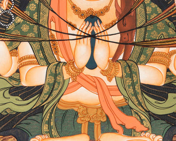 The practice of Avalokiteshvara is encouraged to develop a calm and compassionate heart. Compassion is the root foundation for excelling in the Buddhist path. Kind, Calm, and Open Mind is only possible if we are compassionate. Avalokiteshvara Thangka is used to do visual meditation practice to develop a calm, kind, and compassionate heart.