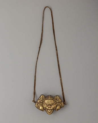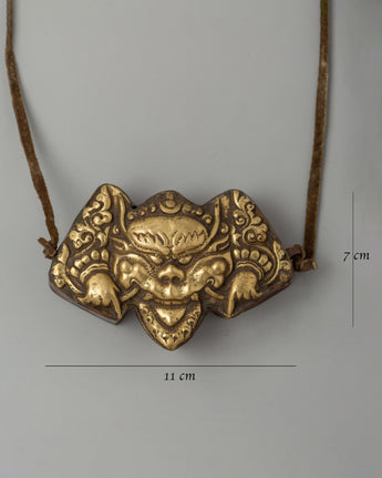 The sides of the symbol are decorated with cloud-like swirling motifs that reflect heavenly energy and spiritual transcendence. These themes represent the movement of spiritual forces between the terrestrial and divine realms, emphasizing the mask's function as a conduit for more incredible energy. Together, the design features of this Ghau Box provide a potent symbol of spiritual defense and purification, making it a valuable and culturally significant relic. Whether worn or displayed, it serves as a protective amulet and a reminder of the continuous spiritual war between good and evil.