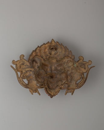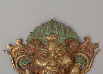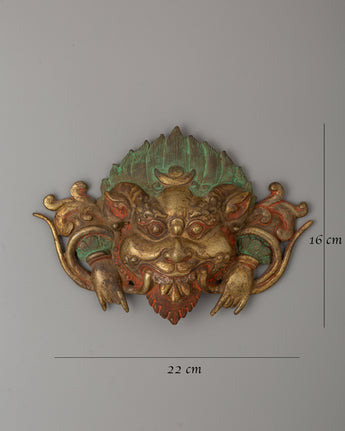 This magnificent Chhepu Mask wall hanging decor is made of top-notch copper, with gold plating and brilliant acrylic colors that highlight its spiritual significance. This mask, measuring 16 cm in height and 22 cm in width, is an excellent choice for any location where you want to instill positive energy, protection, and strength. The craftsmanship showcases Garuda's power and grace, making it an impressive addition to any house or shrine.