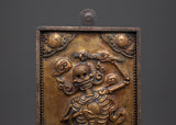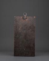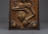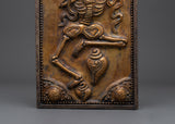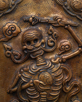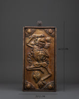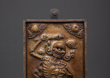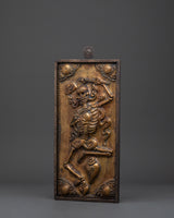 The Chitipati Wall Decor is an exquisite piece of Tibetan spiritual artistry, expertly handcrafted from brass with an iron frame and a wooden back. Measuring 42.5 cm in height and 20.5 cm in width, this captivating wall hanging depicts the revered Chitipati figures, known in Tibetan Buddhism as the "Lord of the Cemetery." They embody protection, wisdom, and the power to transform negative energies into profound spiritual awareness.