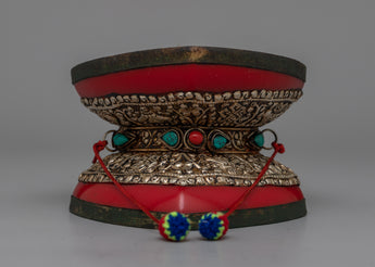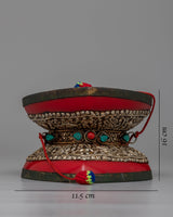 A Chod drum, integral to the Chod spiritual practice in Tibetan Buddhism, is a unique and symbolic instrument. Also known as a damaru, this small, double-sided hand drum has a narrow waist connecting two drumheads. The drum's shape is often likened to the hourglass, embodying the union of wisdom and compassion. Used by Chod practitioners during ritualistic ceremonies, the drum's rhythmic beating is believed to connect with the sacred energies, facilitating meditation and the realization of emptiness. The Chod drum, with its ritualistic role, underscores the synthesis of sound, spirituality, and meditation in Tibetan Buddhist traditions.