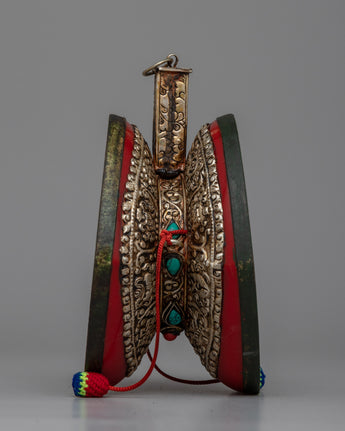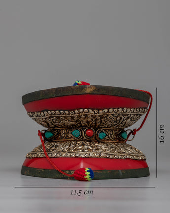 The Chod Damaru is a central instrument in Tibetan Buddhist rituals, distinguished by its distinctive double-sided drumming action. The combination of red resin and leather provides a resonant quality necessary for ritual practices. The silver-plated white metal not only adds to the aesthetic of the drum but also represents its spiritual significance.