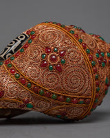 This magnificent piece is handcrafted on a copper body and then plated with 24k gold for a kingly and luxurious appearance. The gemstones are embedded into the piece to add beauty and elegance, and the addition of dzi beads enhances the piece's spiritual significance. Dzi beads are believed to have protective and healing properties in Tibetan culture and are frequently worn as a form of spiritual adornment. This piece's gemstones and dzi beads combine to form a powerful symbol of protection, healing, and spiritual connection.