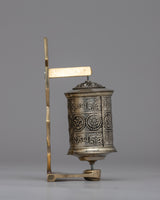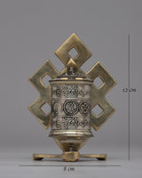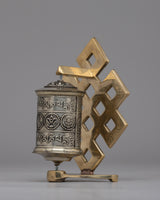 This prayer wheel is ideal for meditation or as a spiritual decor element, combining durability and significant beauty. Its copper and brass structure insures longevity, and its circular pattern magnifies blessings and purifies karma. It's an inspiring addition to any sacred area, combining Buddhist iconography and tradition in harmony.