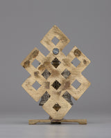 This Copper & Brass Tibetan Prayer Wheel, made with a copper body and a brass base, includes spiritual meaning and superb craftsmanship. It features the mantra Om Mani Padme Hum, which invokes universal compassion and enlightenment with each spin. The wheel is decorated with medallions representing the Treasure Vase, Dharmachakra, and Lotus Flower, which represent spiritual prosperity, purity, and Buddha's teachings. The top finial and Vajra-like backdrop ornamentation add to its spiritual importance, symbolizing durability, knowledge, and compassion.