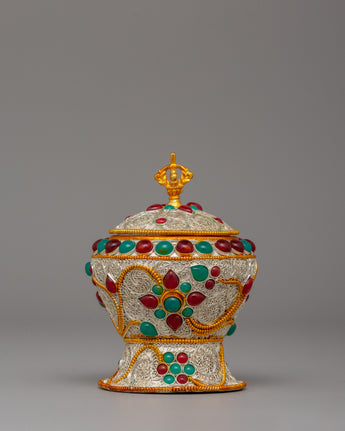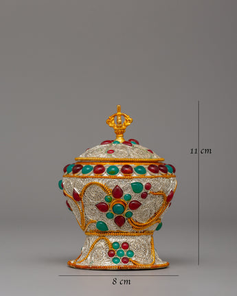 This ceremonial vessel is small and stylish, measuring 11 cm in height and 8 cm in breadth, and weighing 0.22 kilogram. In addition to being a valuable decorative item, it is perfect for holding rice or other offerings during spiritual ceremonies. This is a significant object for any Buddhist practitioner or collector of artifacts since the artificial coral and turquoise stones add to its appearance and represent protective and cleansing forces.
