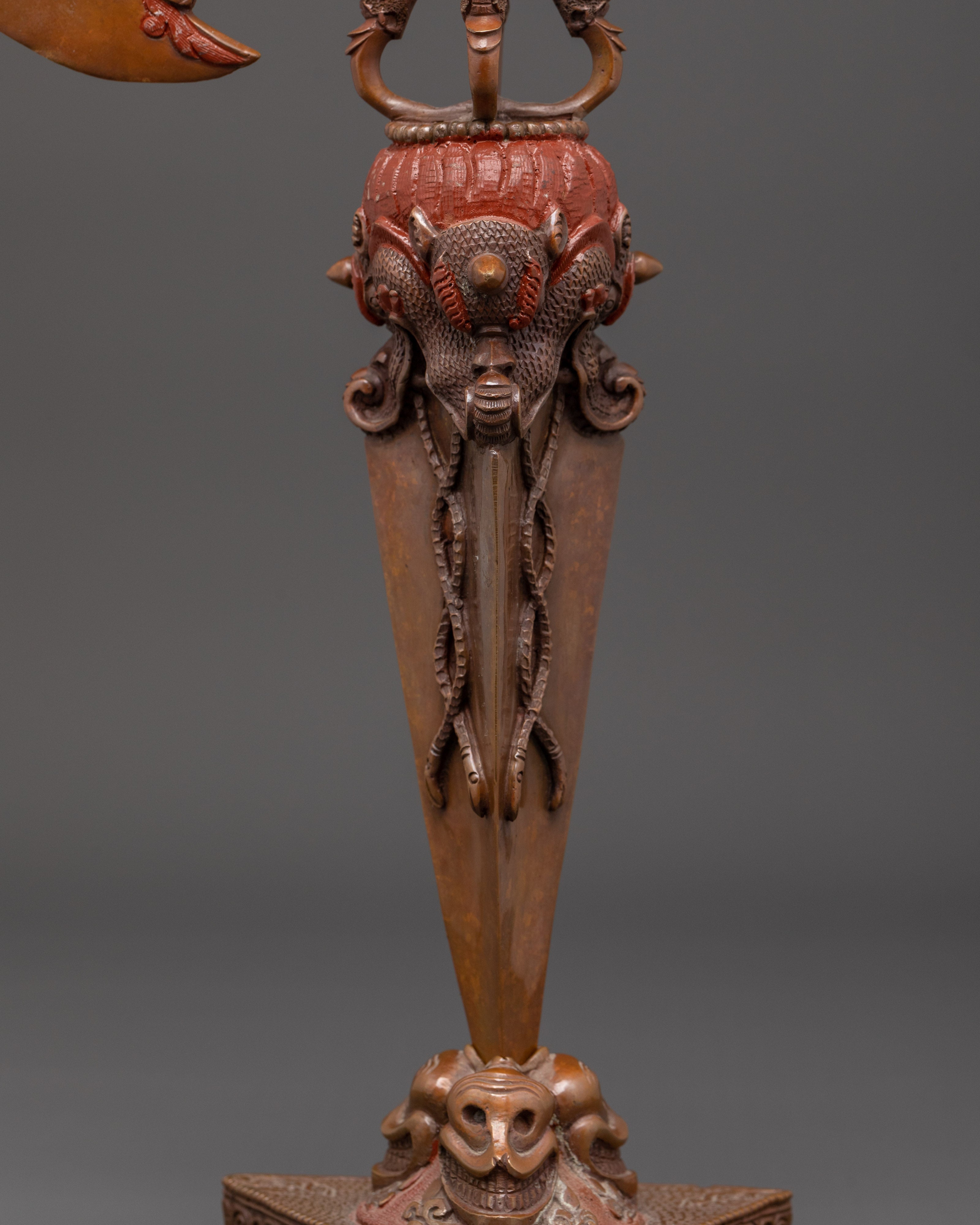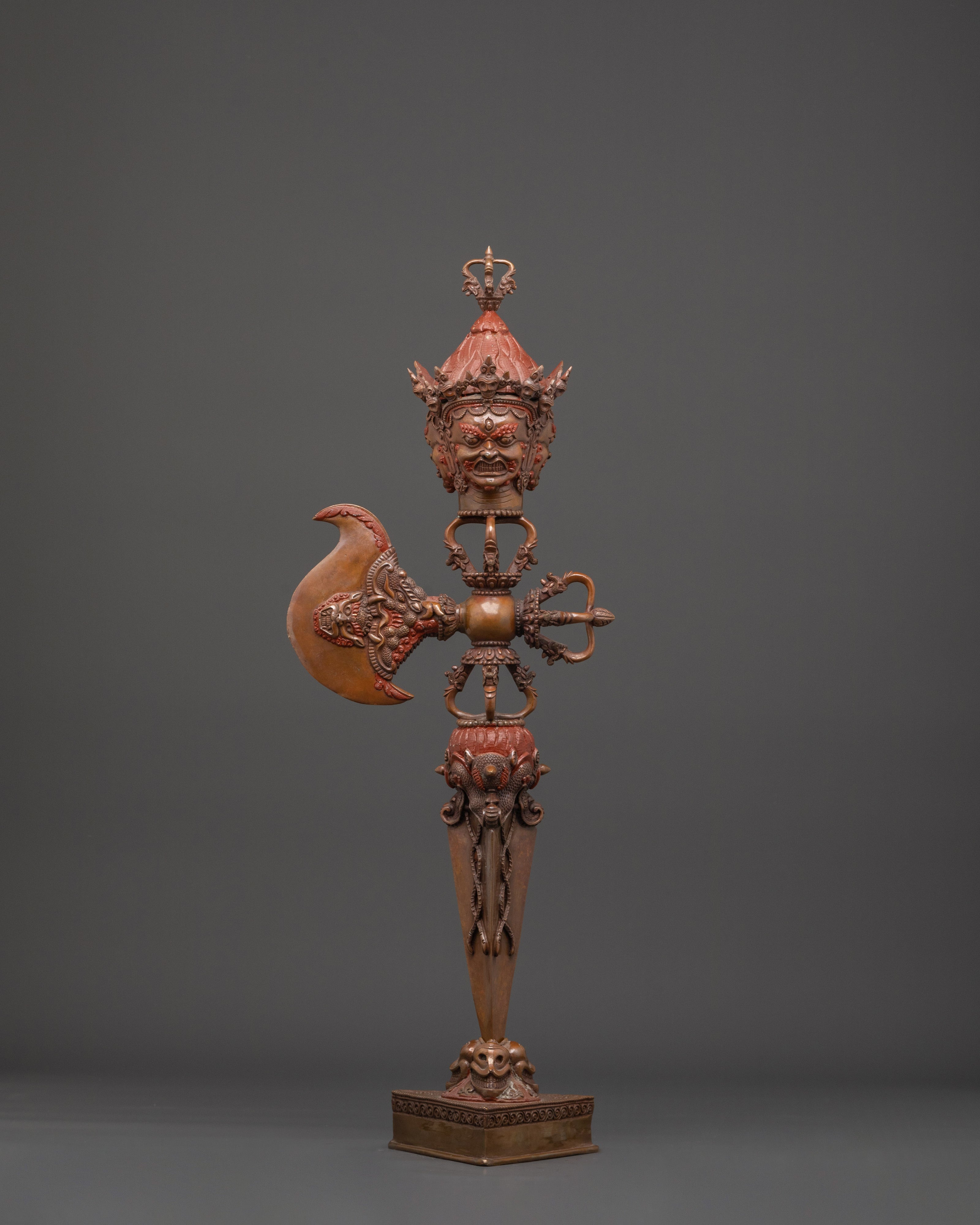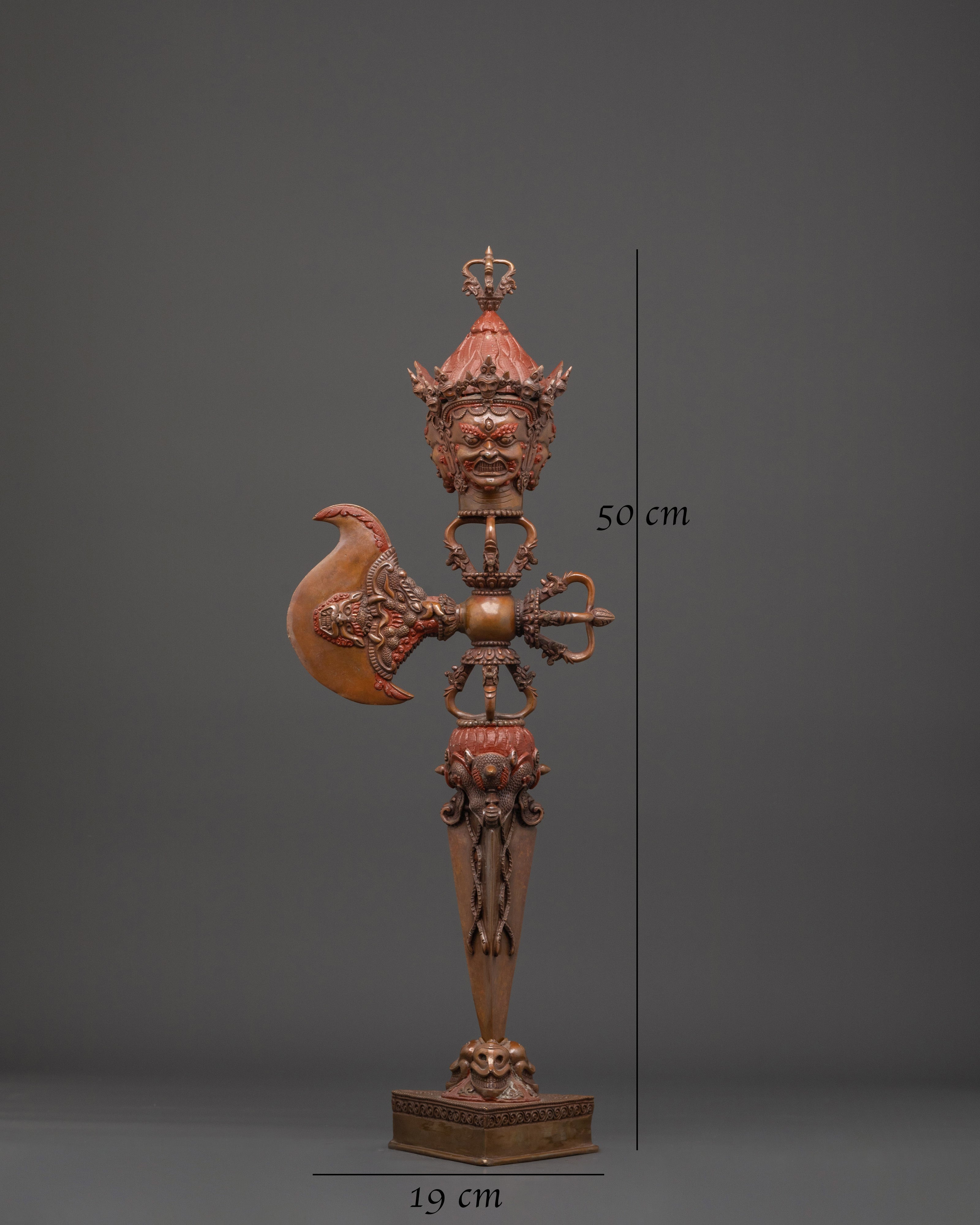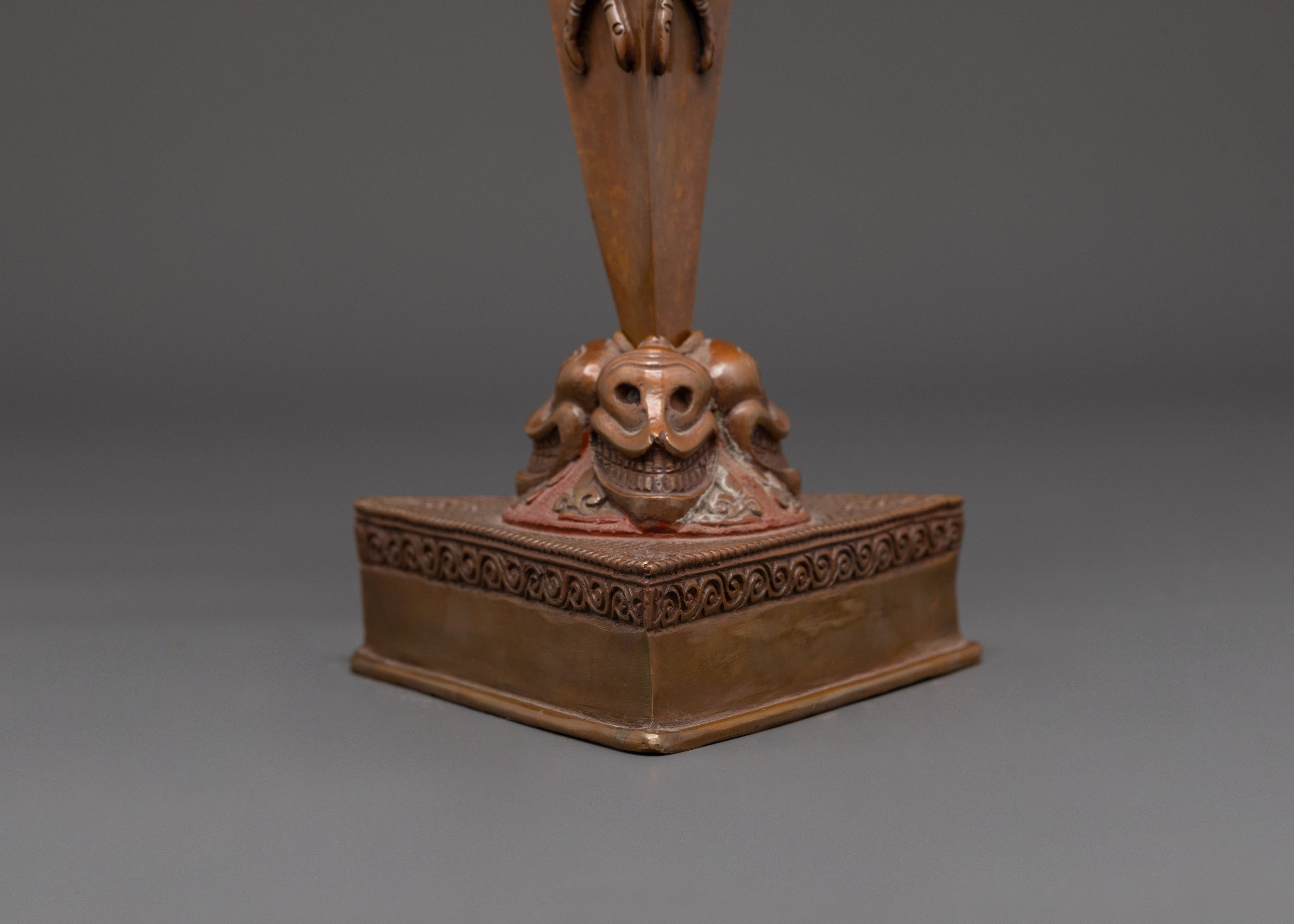 Discover the transformational potential of the Copper Ritual Phurba, a revered Tibetan dagger that has long been used to drive out negativity, pierce spiritual barriers, and guard holy places. This potent ceremonial weapon, which stands an astounding 50 cm tall and 19 cm wide, is crafted from oxidized copper and painted with acrylic hues that represent compassion and divine fury. This Phurba is ideal for serious practitioners, ceremonial leaders, and dedicated spiritual healers due to its substantial presence and weight of 2.67 kg.