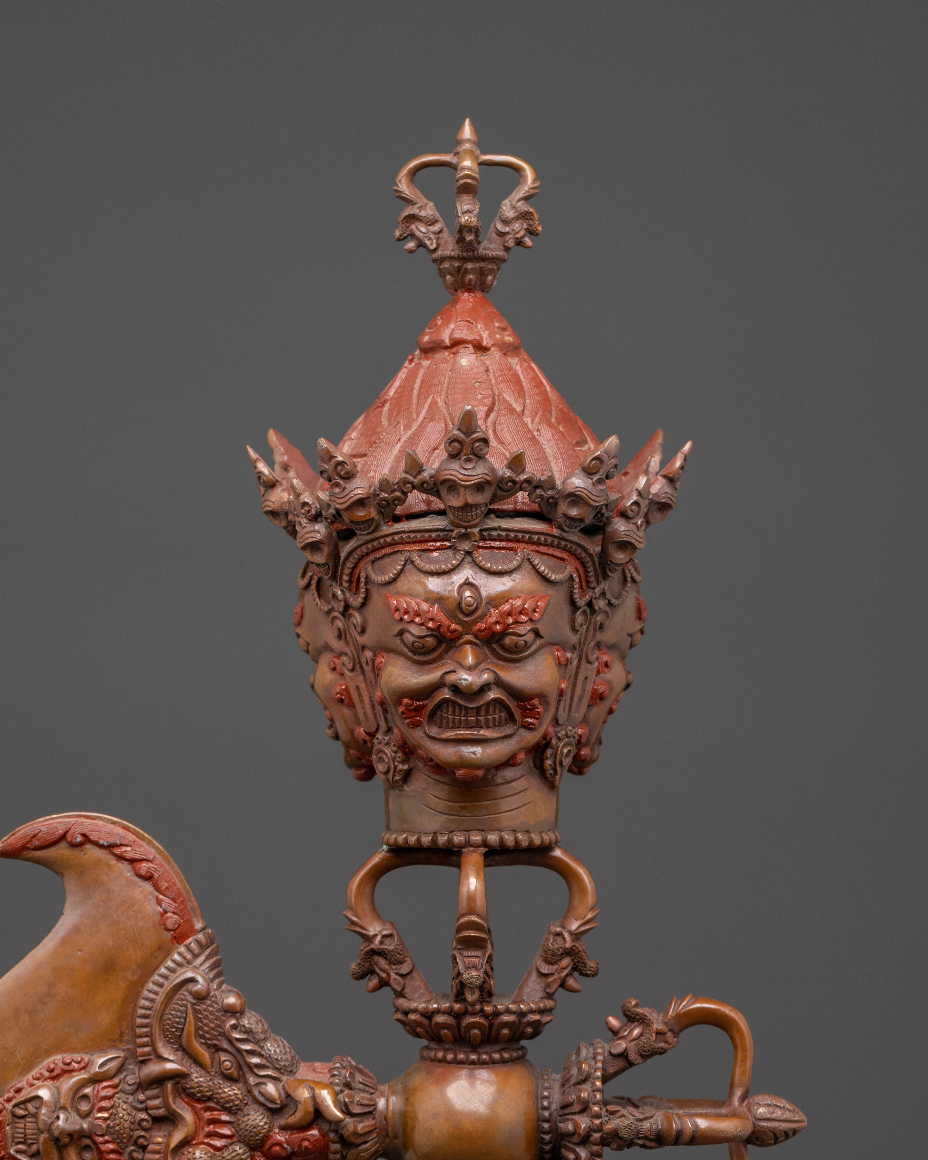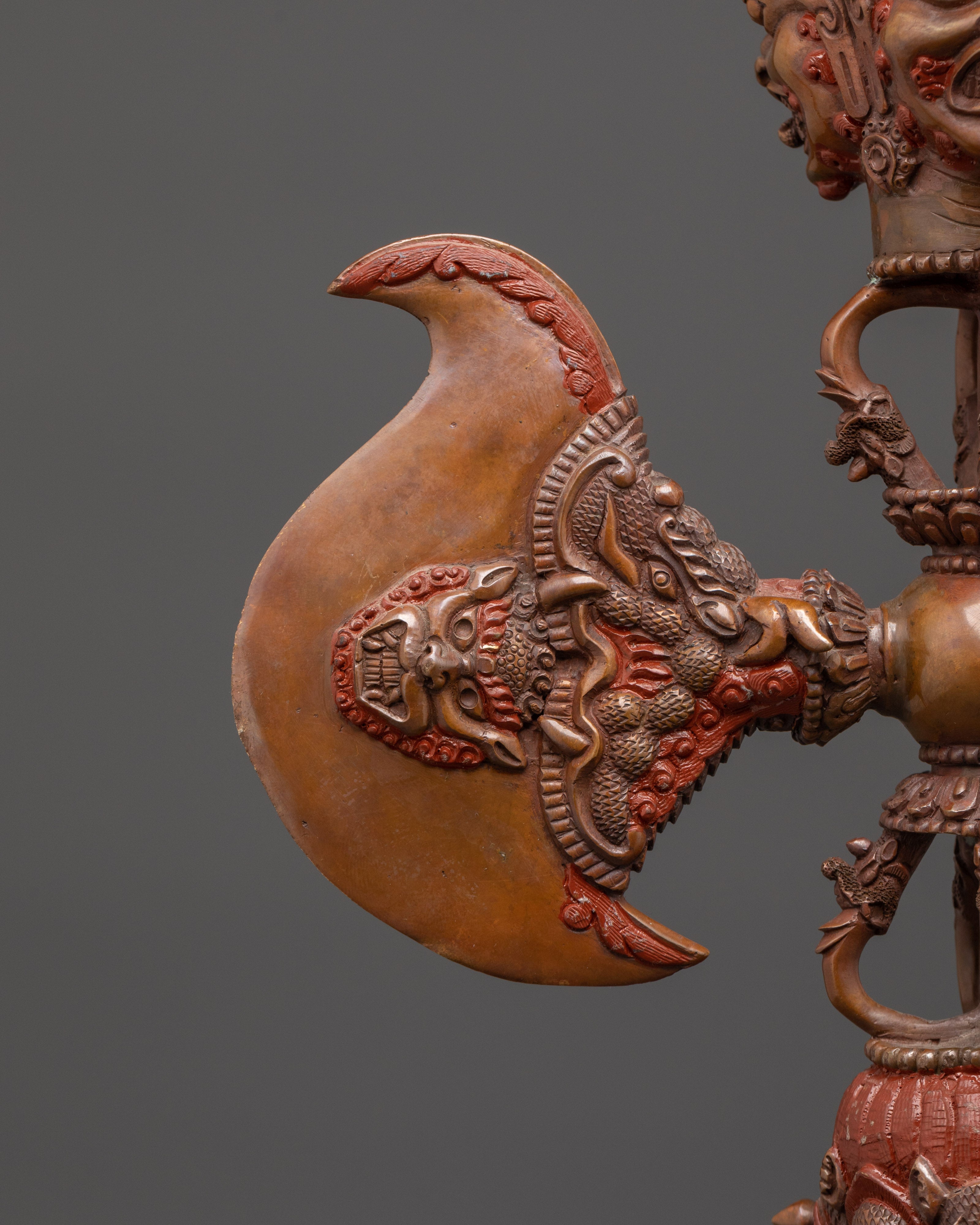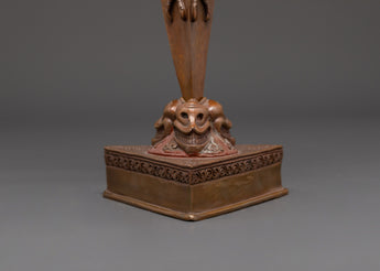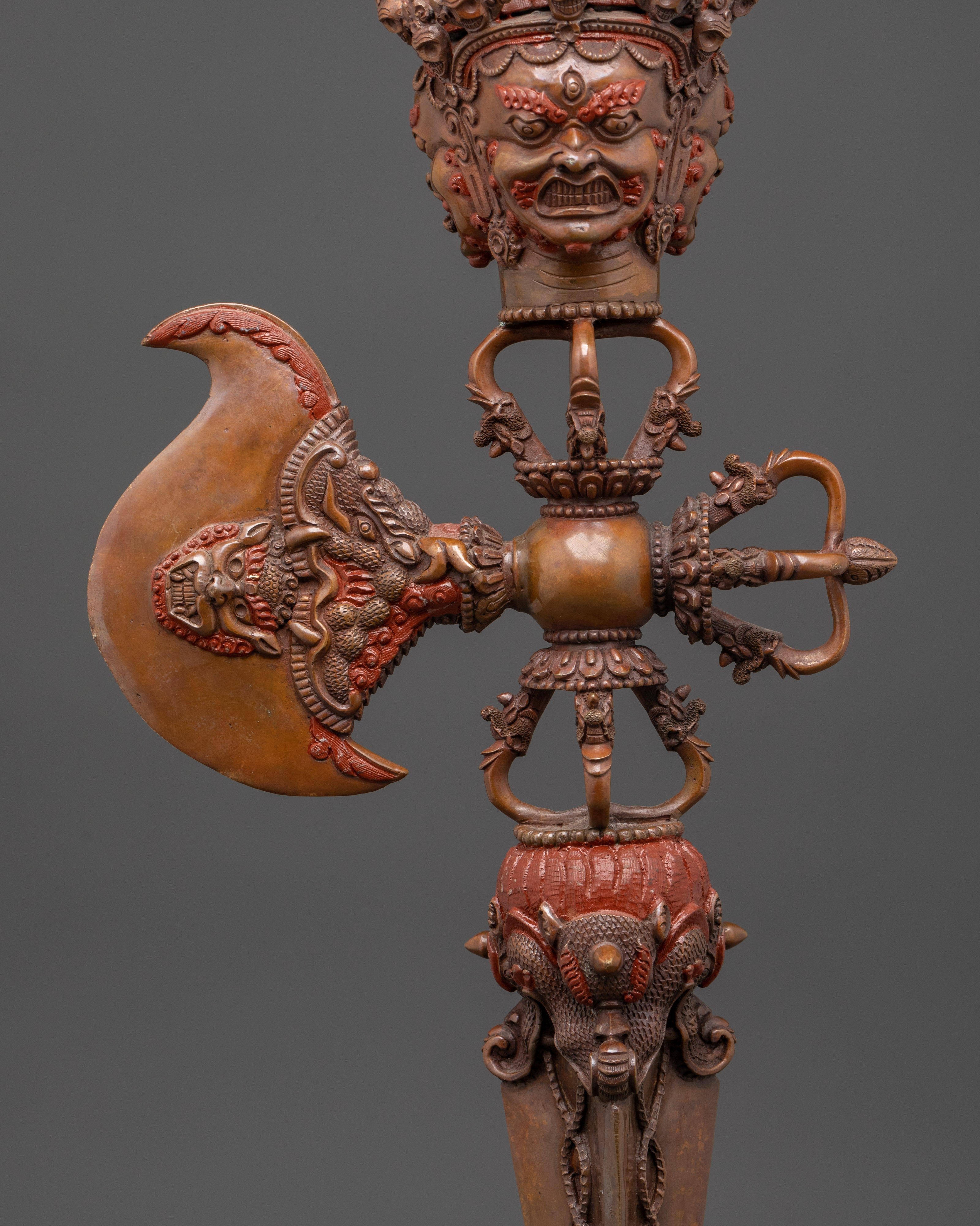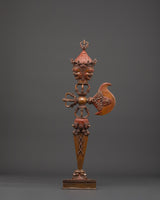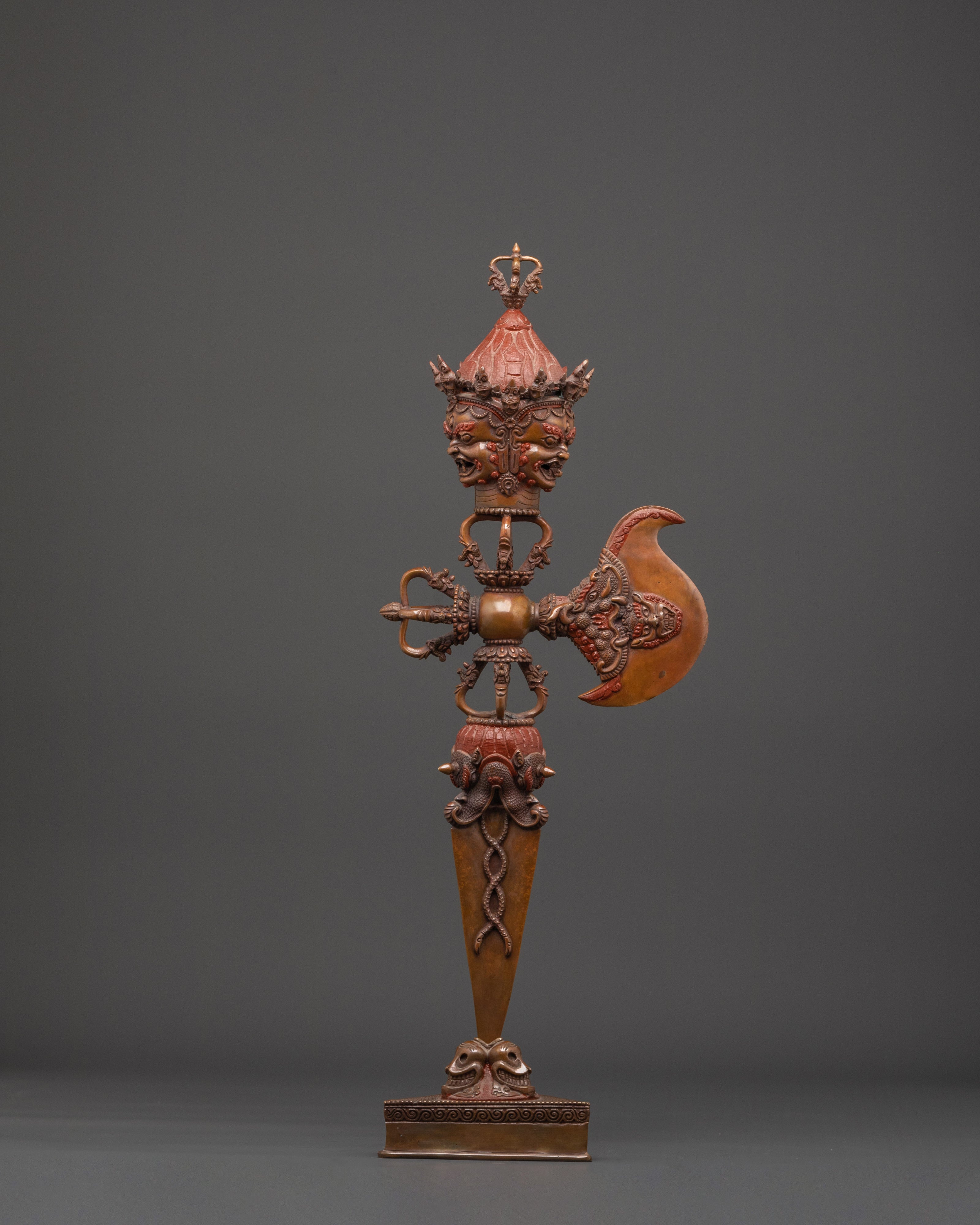 Discover the transformational potential of the Copper Ritual Phurba, a revered Tibetan dagger that has long been used to drive out negativity, pierce spiritual barriers, and guard holy places. This potent ceremonial weapon, which stands an astounding 50 cm tall and 19 cm wide, is crafted from oxidized copper and painted with acrylic hues that represent compassion and divine fury. This Phurba is ideal for serious practitioners, ceremonial leaders, and dedicated spiritual healers due to its substantial presence and weight of 2.67 kg.