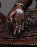 We artistically hand-carved the statue for White Tara Benefits using a traditional Himalayan sculpting technique. Oxidized copper is used to create the body. The deity is seen holding an utpala in each hand while doing the Vitarka mudra with her left hand while reclining on top of a moon disc lotus seat. This sculpture can be used by practitioners for various Vajrayana practices, daily meditation, and yoga. Every attribute of the deity portrayed on the statue is hand-carved using a hammer and chisels.