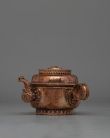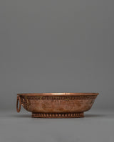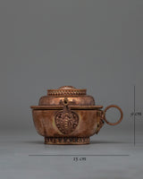 This Copper Tibetan Water Offering Set is made of copper, which reflects its spiritual and symbolic significance. This ceremonial vessel, measuring 9 cm tall by 15 cm at the base and weighing 1.336 kg, is ideal for sacred gifts in Buddhist rites. The copper's shiny sheen represents purity and spiritual illumination, which enhances the set's use in meditation and prayer daily routines.