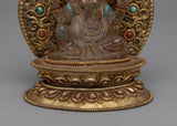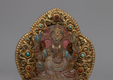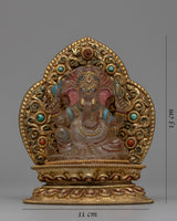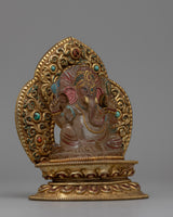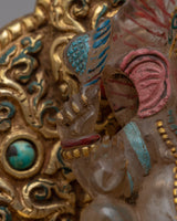 Presenting the exquisite handcrafted Crystal Ganesha Statue with Throne, which unites the spiritual presence of Lord Ganesha with amazing craftsmanship. This magnificent statue embodies the spirit of Ganesha, the remover of obstacles, and symbolizes good fortune, with its fine copper body embellished with dazzling crystal and fantastic gold plating. The imposing seat lends a royal air, while the artificial coral and turquoise stones accentuate its spiritual significance and aesthetic appeal.