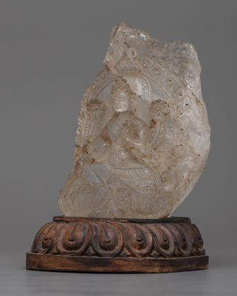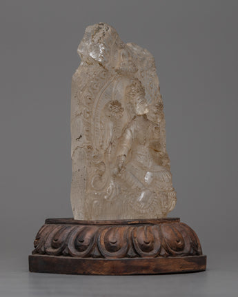 This statue, which stands on a carefully crafted wooden base, combines the warm strength of wood with the ethereal beauty of crystal. This harmonious combination of materials represents the harmony of nature and enlightenment, grounding Green Tara's ethereal qualities in the physical world.