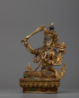Manjushri, also known as the Bodhisattva of Great Wisdom, is one of the most important iconic figures in Mahayana Buddhism. The Vajra Sword of Light or Wisdom is said to cut through ignorance and conceptual entanglements. When the sword is in flames, it also represents the light of transformation. The magnificent Lotus flower is thought to contain the Prajnaparamita Sutra (Great Wisdom Sutra) and the essence of Lord Buddha's great Wisdom.