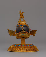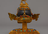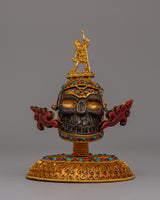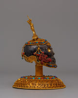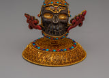 This Handmade Crystal Skull Head, made of copper and embellished with a bright crystal centerpiece, will add a touch of mystique and elegance to your environment. The pattern is supplemented with semi-precious stones like as coral and turquoise, which are recognized for their protecting and healing qualities. Standing 15.5cm tall, this magnificent artwork is a striking ornamental object and a potent symbol of change, clarity, and knowledge. Natural crystal, vivid gemstones, and copper workmanship combine to complement any spiritual or meditation area.