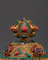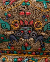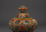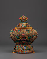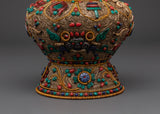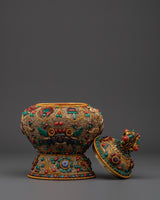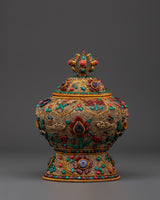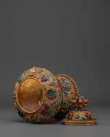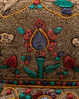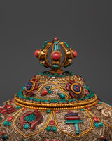 This Decorative Dhupur Rice Pot is a stunning blend of tradition and artistry, making it an ideal addition to your home decor. With a height of 23cm and a width of 16.5cm, this handcrafted piece is made from copper and silver plated, adorned with exquisite semi-precious stones such as turquoise, coral, and lapis lazuli. The Dhupur rice pot is a staple in offerings and decor, and its intricate design also adds a touch of elegance to any space. Perfect for those who appreciate the cultural and functional value of traditional vessels.