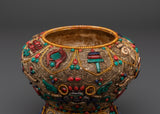 Crafted with care, this Dhupur rice pot features a copper body and a silver-plated finish, making it both a practical vessel and a decorative piece. The semi-precious stones turquoise, coral, and lapis lazuliare skillfully embedded into the pot, offering spiritual and aesthetic benefits. These stones are believed to bring peace, protection, and balance. Weighing 1.28kg, this rice pot is perfect for cooking your favorite rice dishes and can also be proudly displayed as part of your home decor or meditation space, showcasing the beauty of traditional craftsmanship.