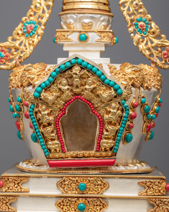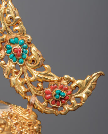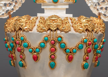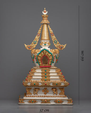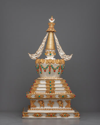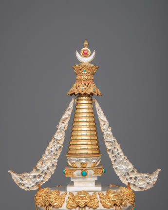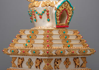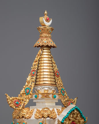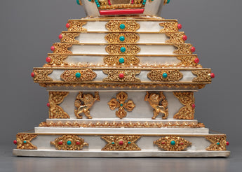The Dharmakaya Stupa is a remarkable piece of craftsmanship. Handcrafted on a Copper body, it is adorned with exquisite 24k gold and silver plating, adding a touch of elegance and grandeur. The stupa is a sacred Buddhist monument symbolizing the enlightened mind and the path to enlightenment. It is believed to radiate positive energy and blessings to its surroundings. The gemstones embedded in the stupa further enhance its beauty and spiritual significance. This Dharmakaya Stupa serves as a powerful symbol of devotion, wisdom, and the ultimate truth of enlightenment in Buddhist practice.