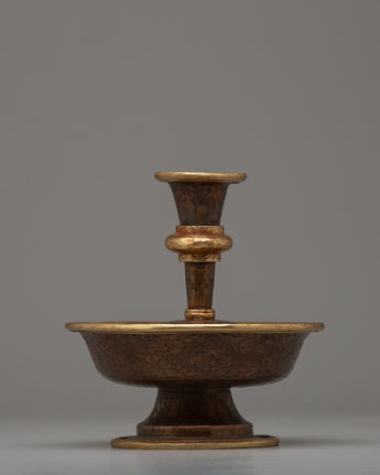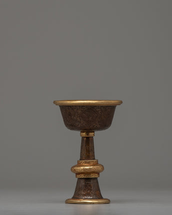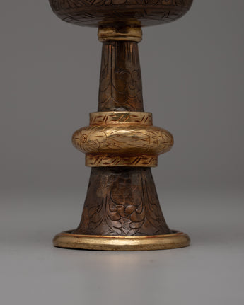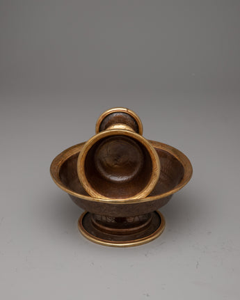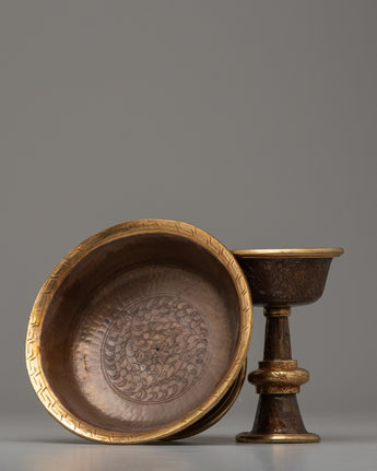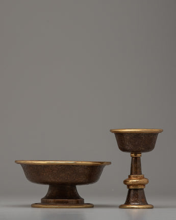 The exquisitely created Dharmapala Offering Serkyem Set, with its oxidized copper body, perfectly captures the rich spiritual legacy of Tibetan Buddhism. This set is an expression of respect and devotion; it is a holy container for gifts made to the guardian gods, known as Dharmapalas. With great care and attention to detail, every piece of the set reflects the rich symbolism and spiritual value found in Tibetan Buddhist rites.