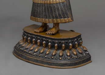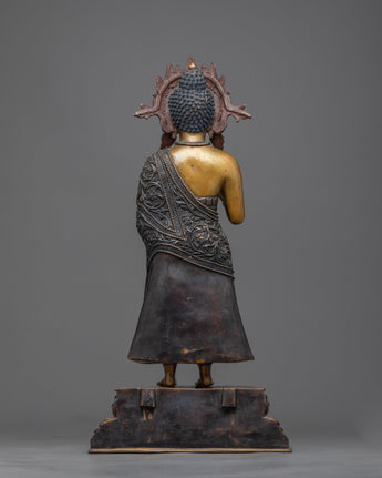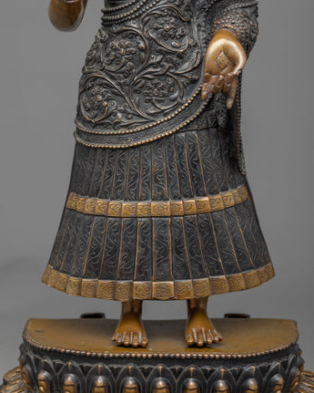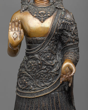 Renowned for forecasting Gautama Buddha's enlightenment, Dipankara Buddha is frequently seen holding hands in the Dharmachakra Mudra, signifying the rotation of the Wheel of Dharma. This sculpture invites the observer to reflect and feel reverence as it embodies Dipankara's profound calm and understanding. The oxidized finish draws attention to the statue's fine details, which include its flowing robes and serene countenance. This focal point will inspire spirituality and historical reverence in any area.