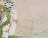 The traditional thangka of Dzambhala is hand-painted in natural Lhasa stone colors and adorned with genuine 24K gold, showcasing the richness and spiritual energy of Tibetan art. This piece, created on high-quality cotton canvas, exemplifies the intricate Karma Gadri style, known for its vibrant and detailed depictions of Buddhist deities. The piece's elegance is further enhanced by the use of natural Lhasa stone hues and the gold highlights, making it a rare and priceless treasure for both spiritual practitioners and collectors.