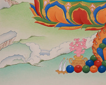 Dzambhala is considered a powerful deity associated with wealth and prosperity in Tibetan Buddhism. His importance reaches beyond worldly wealth; he stands for giving and the development of prosperity in both the temporal and spiritual realms. Dzambhala is traditionally regarded as the guardian of those who follow the Dharma, promoting prosperity as a path to enlightenment. Buddhist art depicts Dzambhala in a regal stance, emphasizing his control over wealth and belongings. His yellow complexion signifies abundance, while his attire represents prosperity. He wears a crown adorned with five sparkling jewels, holds a mongoose that spits out beautiful jewels, and carries a vibrant citron. These symbols exemplify his spiritual and material riches, his capacity to fulfill desires, and his enlightened state. Additional objects, including a conch shell, a vase, and a utpala garland, accentuate his offerings. The thangka exudes an aura of wealth and divine generosity, inspiring observers to seek Dzambhala's blessings for prosperity.