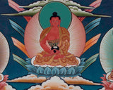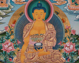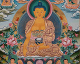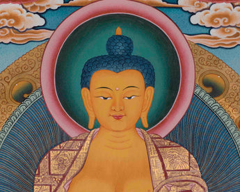 The "Divine Enlightenment: Shakyamuni Buddha, Five Buddhas, and Disciples Thangka" is a Tibetan Buddhist art piece that embodies the profound teachings and spiritual presence of Shakyamuni Buddha. At the heart of this thangka is Shakyamuni Buddha in serene meditation, symbolizing wisdom and compassion. He is seated on a lotus throne, symbolizing purity and spiritual elevation, and his right hand is in the earth-touching mudra, representing his moment of enlightenment under the Bodhi tree. His left hand rests on his lap, symbolizing deep inner peace and contemplation.