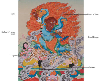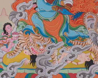 Dorje Drolo is portrayed in a dynamic, wrathful pose, seated upon a roaring tigress, indicating his mastery over ignorance and primal fears. He carries a vajra in one hand, indicating indestructible wisdom, and a ritual dagger (phurba) in the other, symbolizing his power to cut through negativity and impediments. His garland of human skulls symbolizes the transcendence of ego and mortality, while the flames in his halo represent transformational force and heavenly protection. This thangka is a powerful addition to meditation spaces or sacred collections, providing spiritual strength and protection.