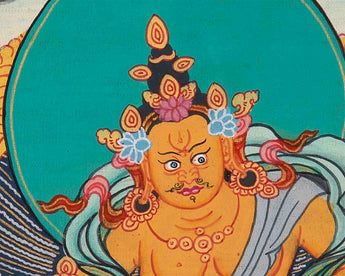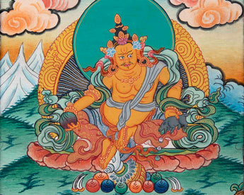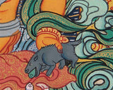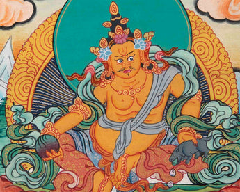 Introduction To The Thangka :Zambala, also known as Kuber is the god of wealth. Zambala or Kubera is also believed to be an emanation of Avalokitesvara or Chenrezig, the Bodhisattva of Compassion. Zambala is the fortune of wealth and prosperity. It is believed that if anyone keeps the painting or statue of Zambala in their home they will be blessed with wealth and prosperity.