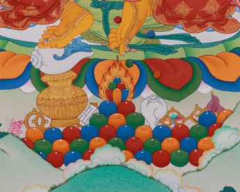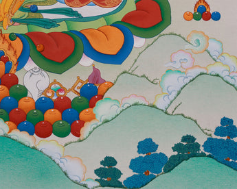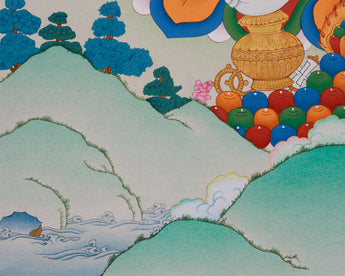 The highly intricate Dzambhala painting, which was created on canvas, follows the revered Karma Gadri style, known for its beauty and harmony. Invoking a sense of grounded spiritual force, the natural stone shapes give the portrayal depth and vibrancy. From the celestial aura enveloping Dzambhala to his sacred jewels, his meticulous details are illuminated by genuine 24K gold embellishments. The cotton canvas acts as a timeless medium for this spiritual masterpiece in addition to improving the artwork's texture and longevity. Every component is painted following traditional meditation guides, guaranteeing that the Thangka is authentic and has spiritual meaning.